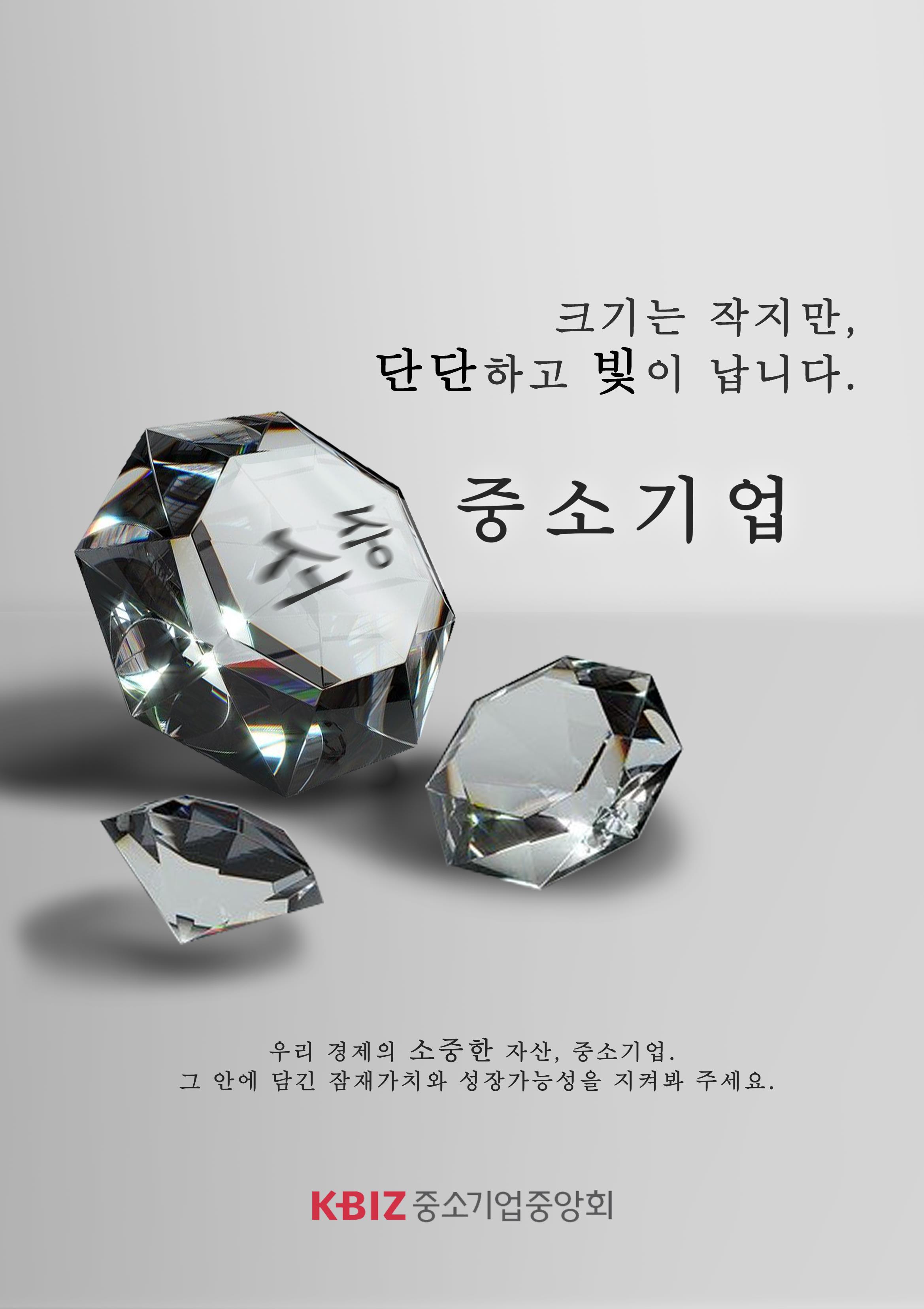 다이아몬드 보석의 이미지와 속성에 빗대어 외견상 작아 보이더라도 단단하고 빛이 나는 중소기업의 큰 가치를 표현하였습니다. 기업 규모는 크지 않더라도 내실 있고, 성장을 이룰 중소기업에 대한 긍정적 인식을