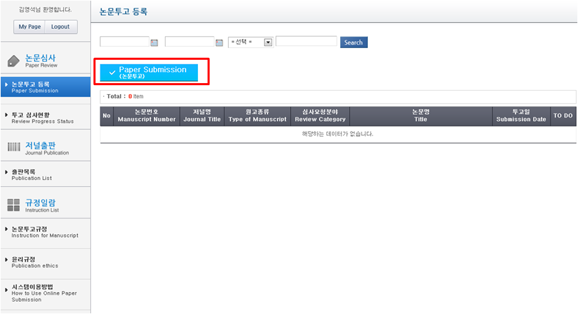 4. 투고 논문 등록 - 논문투고신청서 필히 작성 - 연구윤리준수 동의서 필히 작성 - 투고료 납입 여부 “예” - "submit" 클릭 후 완료 |
