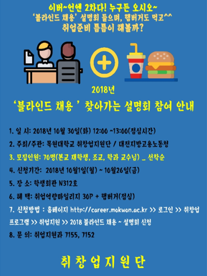 탐방기업 : 플랜아이(IT),맥키스컴퍼니 주관/주최: 고용노동부, 대전고용센터/ KT&G인재개발원 장소 : 탐방기업 및 KT&G 인재개발원 신청기간 : 2018년 10월 8일(월)~10월22일(월) 신청방법 : 목원대학교 홈페이지 내 취창업지원단 클릭>>로그인>>취업프로그램>>취업지원>>중소기업탐방프로그램 신청 필수사항 : 워크넷 회원가입 필수 (고용노동부 프로그램 참여) 혜택 : 참가비 무료, 취업역량마일리지 80P, 참가자에게 출석인정 처리, 참가자 중 10명 추첨하여 커피상품권 증정, 참자가 전원에게 기념품(고용노동부/KT&G제품) 문의 : 취업지원과 8255, 7152 |