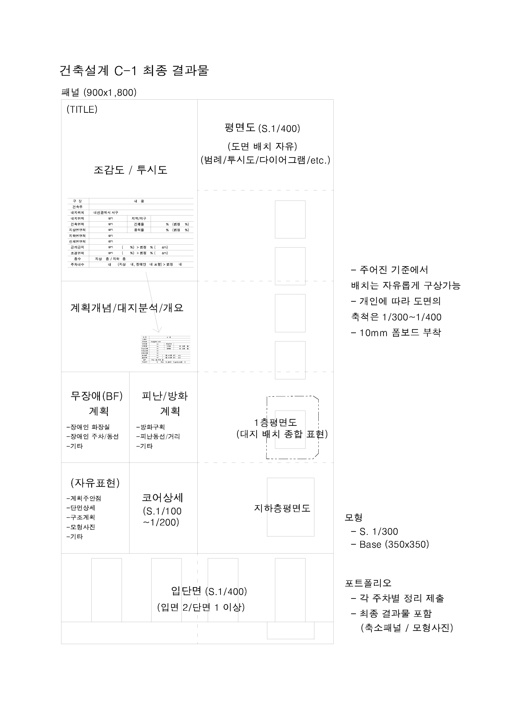 - 계획안 크리틱 > 입단면도 검토 (과제) 리뷰도면 작성 > A4 사이즈로 출력(선두께, 표현) - 1층 평면도 - 기준층 - 코어확대평면도 - 입면도 - 단면도 |