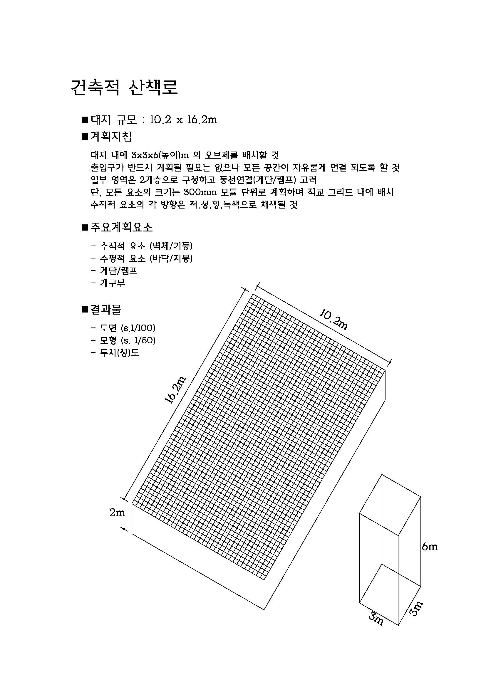 ■ 건축적 산책로 -1 - 수직 및 수평요소를 이용한 공간구성 > 주어진 대지(10x16m)위에 수직 및 수평 요소를 활용하여 공간구성 > 모든 공간이 연속될 수 있도록 공간구성 > 과제 자료 참조 |