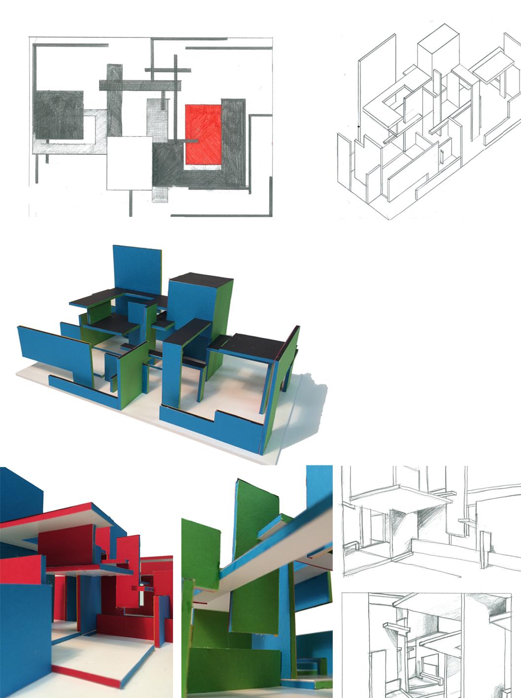 ■ 공간구성 -2 - Brick Villa 벽체를 이용한 공간구성 > 공간구성-1에서 사용된 수직벽체 요소를 이용하여 공간 재구성 > 벽체의 길이, 높이, 개수를 그대로 이용하며 배치를 자유롭게 변형 > 공간의 연속성 및 공간감에 대한 스터디 (부분 스케치 및 모형 S.1/50 작성) |