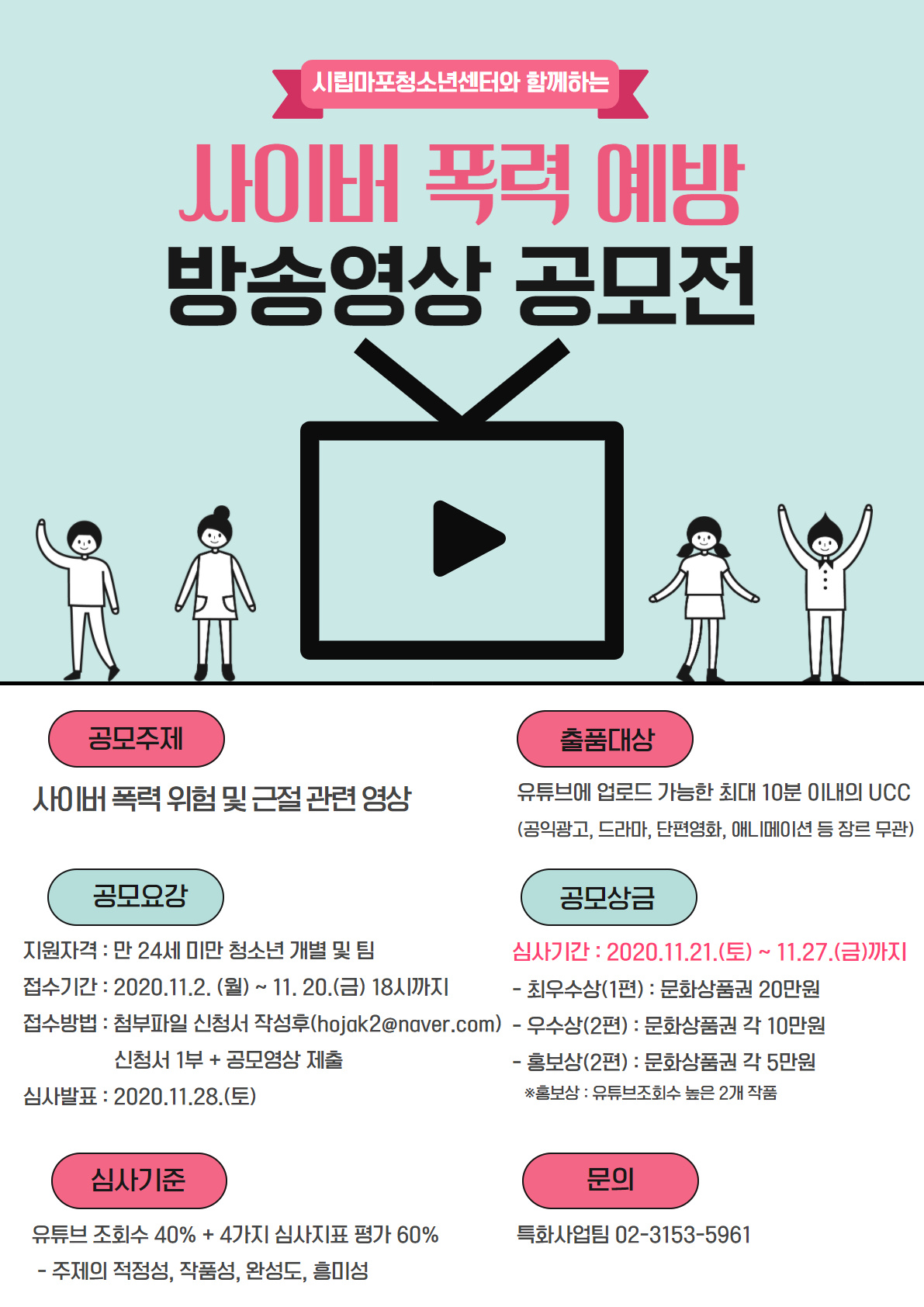 인터넷의 발달과 코로나로 인하여 청소년들의 인터넷 사용 시간도 늘어나며 사이버 폭력의 사건과 피해가 늘어남에 따라 인터넷폭력 근절 영상 공모전을 통해 올바른 인터넷 문화를 형성한다.
