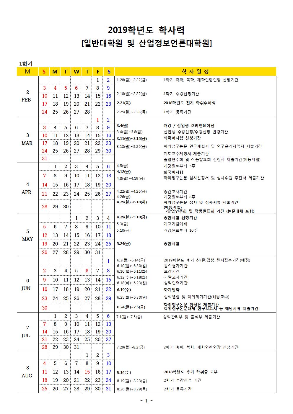 2019학년도 1학기 학사력(산업정보언론대학원)