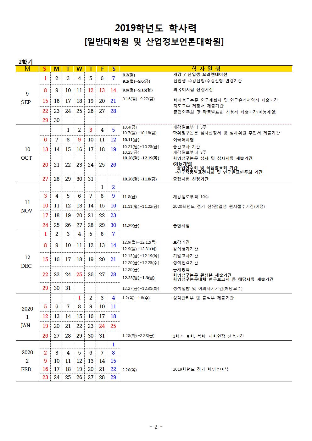 2019학년도 2학기 학사력(산업정보언론대학원)