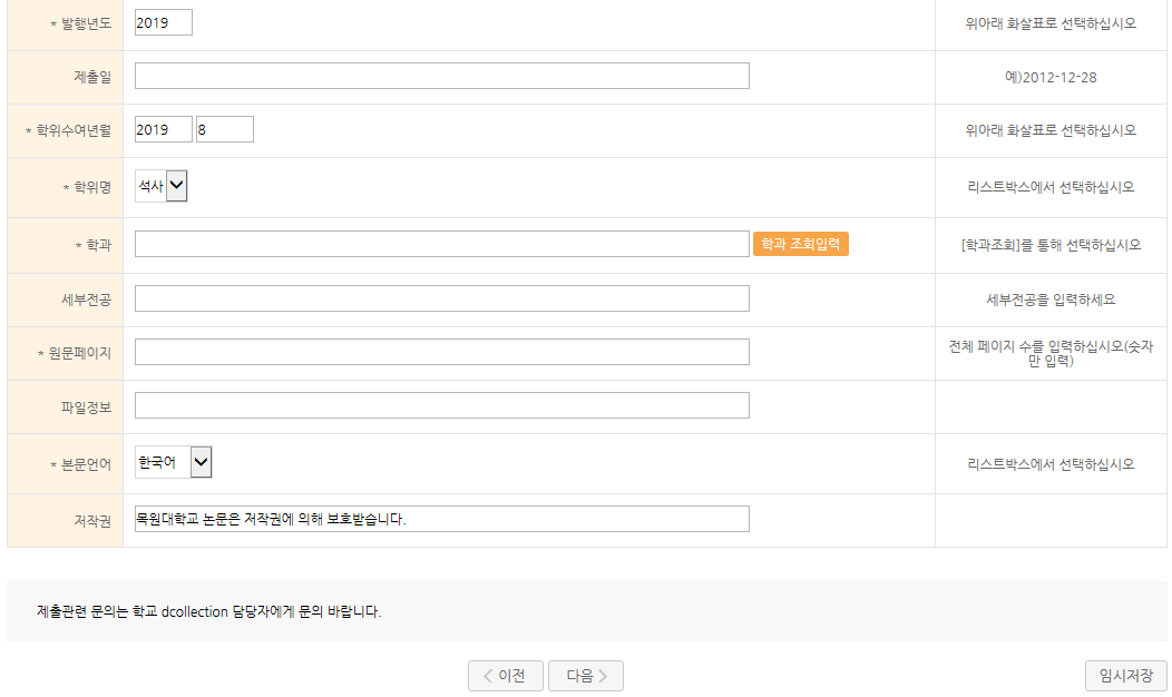 - 발행기관, 발행년도, 학위수여년월은 기본값으로 입력되어 있기 때문에 수정할 필요 없음