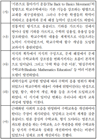 1. 다음은 19세기말부터 100여 년 동안 이루어진 수학교육의 변천에 관한 자료를 순서 없이 제시한 것이다. (가)∼(마)를 수학교육의 역사적 흐름에 따라 순서대로 배열하시오. [2점]