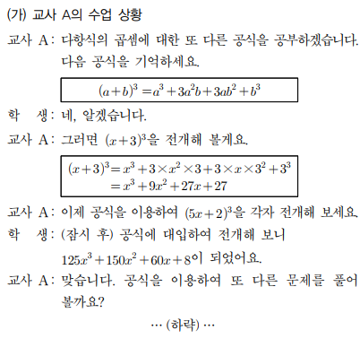 2. 다음 (가), (나)는 교사 A와 B가 다항식의 곱셈을 지도하는 수업상황이다.
