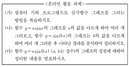 7. 박 교사는 고등학교 ‘수학1’ 삼각함수 단원에서 <수업 방향>에 따라 <온라인 활동 과제>를 활용한 실시간 온라인 수업을 하려고한다. 이에 대하여 <작성 방법>에 따라 서술하시오. [4점] <수업방향>