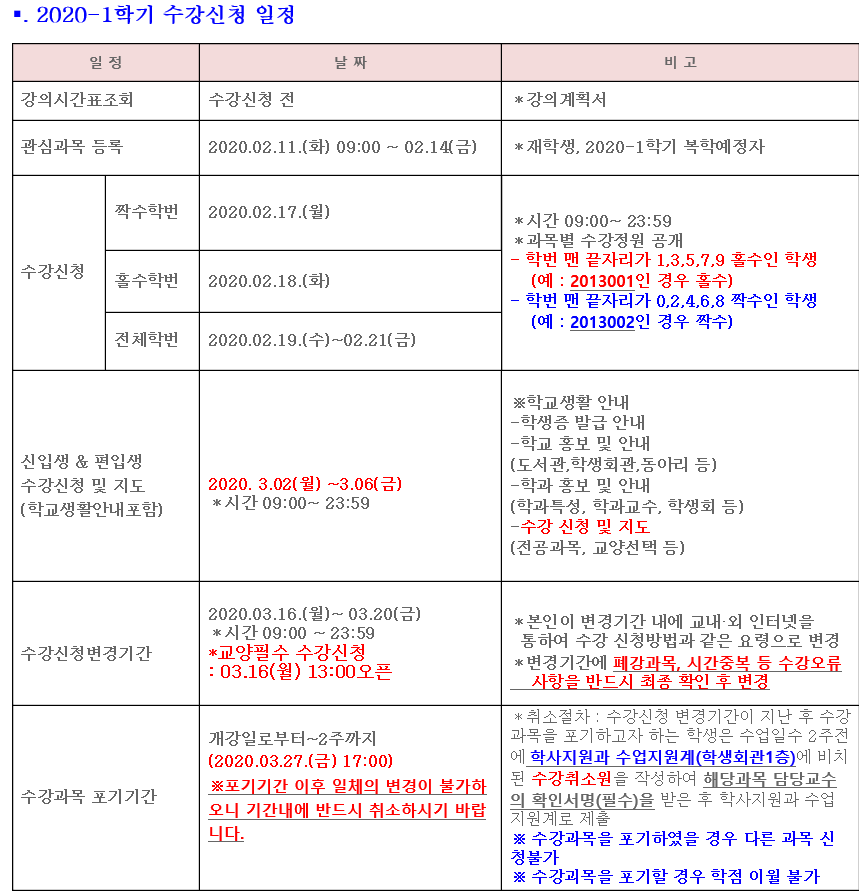 학번의 맨 뒷자리의 수를 가지고 홀수, 짝수로 구분하며 수강신청일정을 달리 한다.