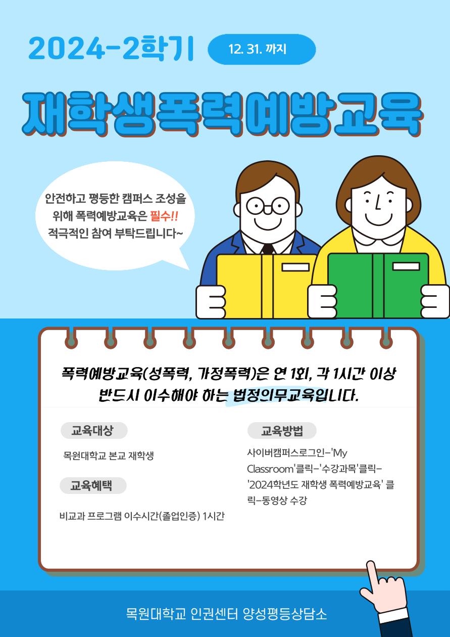 2. 위와 관련하여, 인권센터 양성평등상담소에서는 여성가족부 지침에 따라 본교 재학생을 대상으로 폭력예방교육(성폭력, 가정폭력)을 실시하고 있습니다.