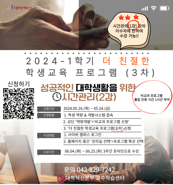 4차산업혁명 시대를 선도하는 금융 및 경제 전문가 양성대학혁신본부 교수학습센터에서는 학과적응과 학습역량 강화를 위하여 2024-1학기 더 친절한 학생교육 프로그램을 아래와 같이 운영하고자 안내하오니 많은 참여 부탁드립니다. 2차(1강), 3차(2강) 연속 프로그램입니다.