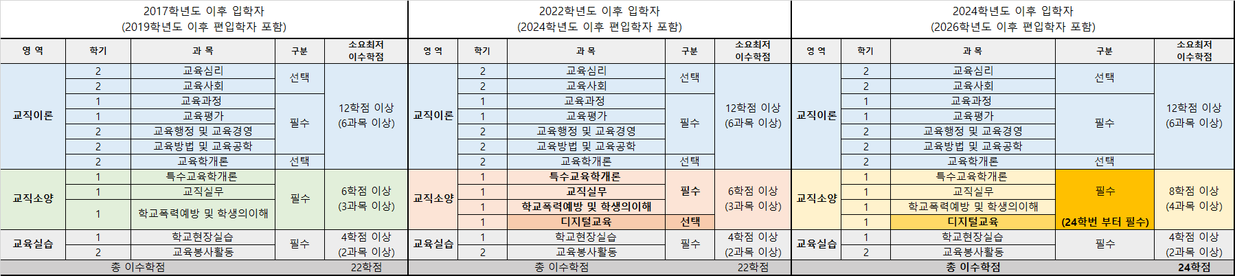 - 24학번부터 '디지털 교육' 과목이 필수로 전환되면서 교직과목 총 이수학점이 24학점으로 늘어남.