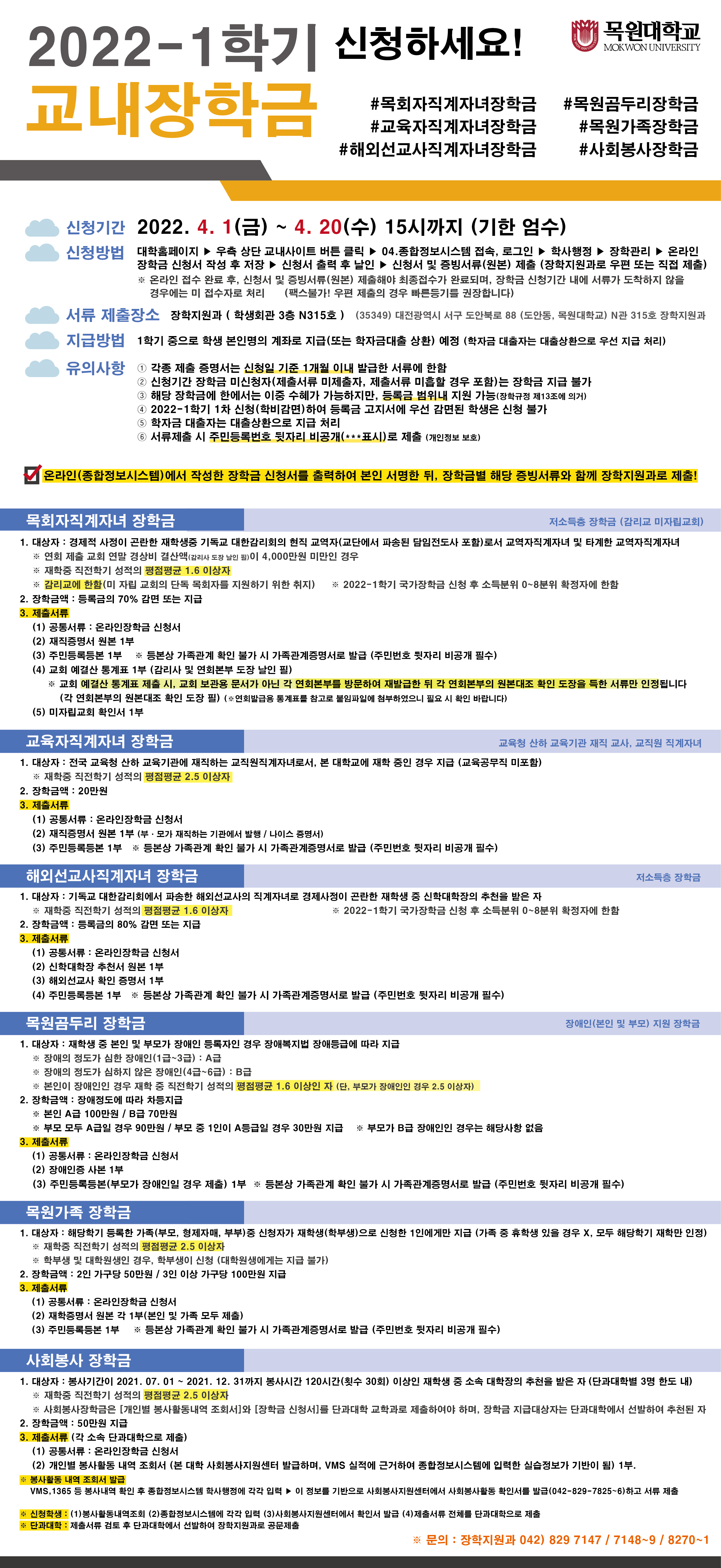 5. 제출방법 : (1)온라인장학금 신청서(출력 및 날인) 및 (2)증빙서류를 장학지원과(학생회관3층 N315호) 본인 직접 제출 (또는 우편 제출)