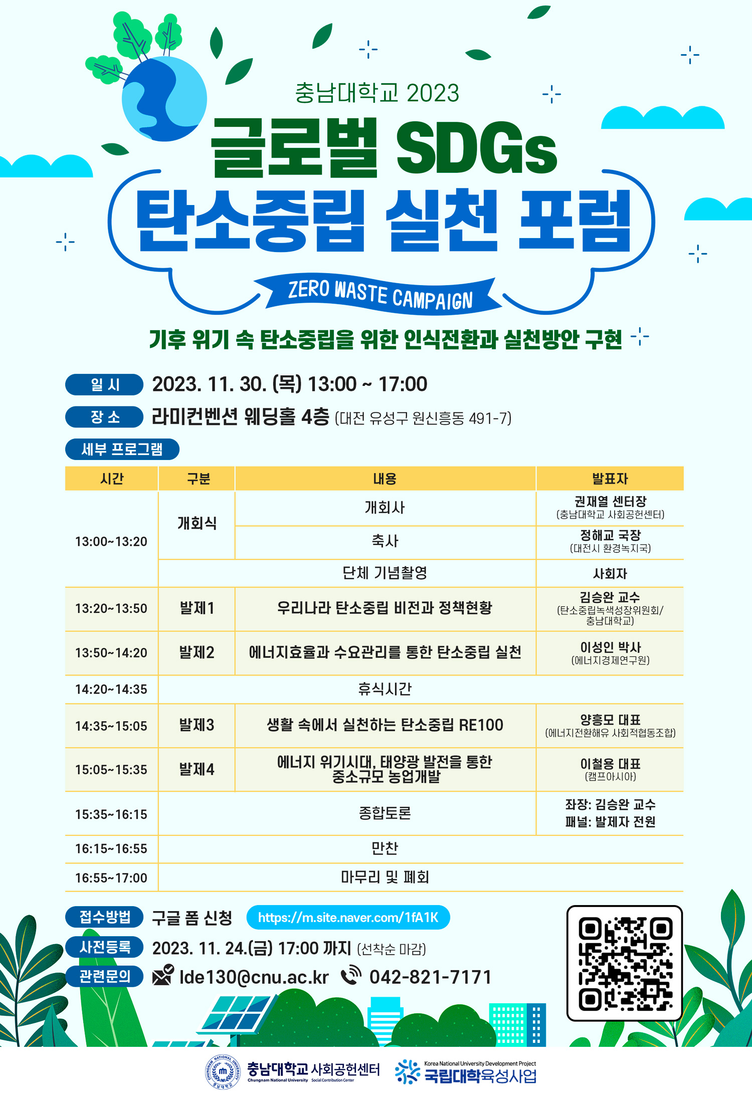 GRADUATE SCHOOL OF충남대학교 사회공헌센터에서는 국립대학육성사업의 일환으로 ‘2023 글로벌 SDGs 탄소중립 실천 포럼’을 다음과 같이 개최하오니 소속 교직원 및 학생들에게 적극적인 홍보합니다.