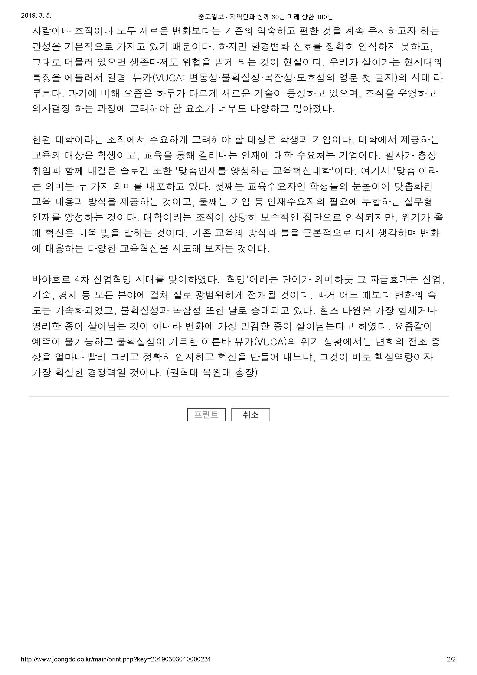 MOKWON UNIVERSITY혁신성장, 규제혁신, 개방형 혁신, 스마트 혁신. 요즘 "혁신(innovation)"이라는 단어가 사회적으로 큰 주목을 받으면서주변에서 심심찮게 듣게 된다. 사전적인 의미로 묵은 관습이나 조직, 방법 등을 완전히 바꿔서 새롭게 함을 뜻하는 혁신의 개념은 기존의 것을 좀 더 발전시켜 얻게 되는 "개선(improvement)"과는 근본적으로 차이가 있는 개념이다. 즉혁신이란 기존의 것과 전혀 다른 새로운 것을 말한다. 개인이나 조직이 처해 있는 환경 여건이 현재의 방식으로는 극복이 어렵다고 인식하게 될수록 혁신의 본질적 개념은 더욱와닿게 된다. 얼마 전 세계 최고의 선두기업이라 불리는 애플의 실적 악화에 따른 주가 폭락 소식이 들려와 충격을 준 바 있다. 애플의 최고경영자인 팀 쿡은 실적 부진의 주된 원인으로 미·중 무역갈등과 그로 인한 중국 내 아이폰 판매 급감을 꼽았다. 하지만 업계 전문가들의 시각은 자못 다르다. 바로 "혁신의 부재"를 애플이 맞은 위기의 근본 원인으로 보고 있다. 혁신의 아이콘이라 불리던 애플이 2000년대 초반 소위 "아이폰 혁명"으로 스마트폰 시대를 열었지만, 이후눈에 띌만한 혁신적인 신제품을 시장에 내놓지 못하게 되면서 시장의 신뢰를 잃었다는 것이다. 불과 10년 전만 해도 세계 최고의 기업으로 불리던 노키아, 코닥, GM, 소니 등과 같이 우리가잘 알고 있는 다수 글로벌 대기업마저도 시장 변화를 제대로 읽지 못하여 경영상 상당한 어려움을 겪거나 몰락의 길을 걷게 된 사례는 시사하는 바가 크다. 한마디로 영원한 일등은 없다는 것이다. 치열한 경쟁과 악화된 경영환경 속에서 살아남고, 이를 넘어 지속가능한 기업이 되는 열쇠는 시장의 수요와 환경변화에 발맞추어 적절히 대응할 수 있는 혁신의 실행에 달려있다는 것이다. 이처럼 환경변화에 대한 시의적절한 인식과 혁신은 떼려야 뗄 수 없는 관계이다. 현실적으로 과거에 가지고 있던 습관과 방식을 일순간에 바꾸는 것은 결코 쉽지 않다. 왜냐면 사람이나 조직이나 모두 새로운 변화보다는 기존의 익숙하고 편한 것을 계속 유지하고자 하는 관성을 기본적으로 가지고 있기 때문이다. 하지만 환경변화 신호를 정확히 인식하지 못하고, 그대로 머물러 있으면 생존마저도 위협을 받게 되는 것이 현실이다. 우리가 살아가는 현시대의 특징을 에둘러서 일명 "뷰카(VUCA: 변동성·불확실성·복잡성·모호성의 영문 첫 글자)의 시대"라 부른다. 과거에 비해 요즘은 하루가 다르게 새로운 기술이 등장하고 있으며, 조직을 운영하고 의사결정 하는 과정에 고려해야 할 요소가 너무도 다양하고 많아졌다. 한편 대학이라는 조직에서 주요하게 고려해야 할 대상은 학생과 기업이다. 대학에서 제공하는 교육의 대상은 학생이고, 교육을 통해 길러내는 인재에 대한 수요처는 기업이다. 필자가 총장 취임과 함께 내걸은 슬로건 또한 "맞춤인재를 양성하는 교육혁신대학"이다. 여기서 "맞춤"이라는 의미는 두 가지 의미를 내포하고 있다. 첫째는 교육수요자인 학생들의 눈높이에 맞춤화된 교육 내용과 방식을 제공하는 것이고, 둘째는 기업 등 인재수요자의 필요에 부합하는 실무형 인재를 양성하는 것이다. 대학이라는 조직이 상당히 보수적인 집단으로 인식되지만, 위기가 올 때 혁신은 더욱 빛을 발하는 것이다. 기존 교육의 방식과 틀을 근본적으로 다시 생각하며 변화에 대응하는 다양한 교육혁신을 시도해 보자는 것이다. 바야흐로 4차 산업혁명 시대를 맞이하였다. "혁명"이라는 단어가 의미하듯 그 파급효과는 산업,기술, 경제 등 모든 분야에 걸쳐 실로 광범위하게 전개될 것이다. 과거 어느 때보다 변화의 속도는 가속화되었고, 불확실성과 복잡성 또한 날로 증대되고 있다. 찰스 다윈은 가장 힘세거나영리한 종이 살아남는 것이 아니라 변화에 가장 민감한 종이 살아남는다고 하였다. 요즘같이예측이 불가능하고 불확실성이 가득한 이른바 뷰카(VUCA)의 위기 상황에서는 변화의 전조 증상을 얼마나 빨리 그리고 정확히 인지하고 혁신을 만들어 내느냐, 그것이 바로 핵심역량이자 가장 확실한 경쟁력일 것이다. (권혁대 목원대 총장) [기사 링크 : http://www.joongdo.co.kr/main/view.php?key=20190303010000231] |