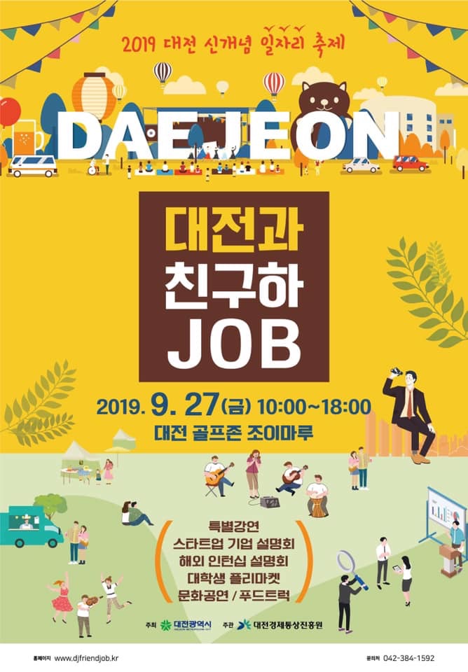 가. 일 시: 2019.09.27.(금) 10:00 ~ 18:00 나. 장 소: 대전 골프존 조이마루(유성구 도룡동) 다. 참여대상: 대전시 소재 대학생 및 구직희망자 라. 참여기업: 전국·지역소재 스타트업(30여개), 해외취업 유관기관(7개) 등 마. 참가방법: www.djfriendjob.kr 홈페이지 참고(사전접수), 당일현장방문 바. 학교버스운행 시간: 총 3회 (1회/10:10분, 2회/13:00시, 3회14:00시) 사. 학교버스출발 장소: 학생회관 사거리 아. 문 의: MICE UNION(마이스 유니온) 042-384-1592, 취업지원과 7152 -취창업지원단장- |