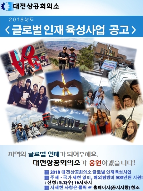 대전상공회의소는 우리 지역 미래인재육성을 위해 지역사랑 및 글로벌 마인드를 갖춘 인재를 발굴, 글로벌 체험학습 기회를 부여하는 ‘2018 대전상공회의소 글로벌인재육성사업’을 다음과 같이 공고합니다.