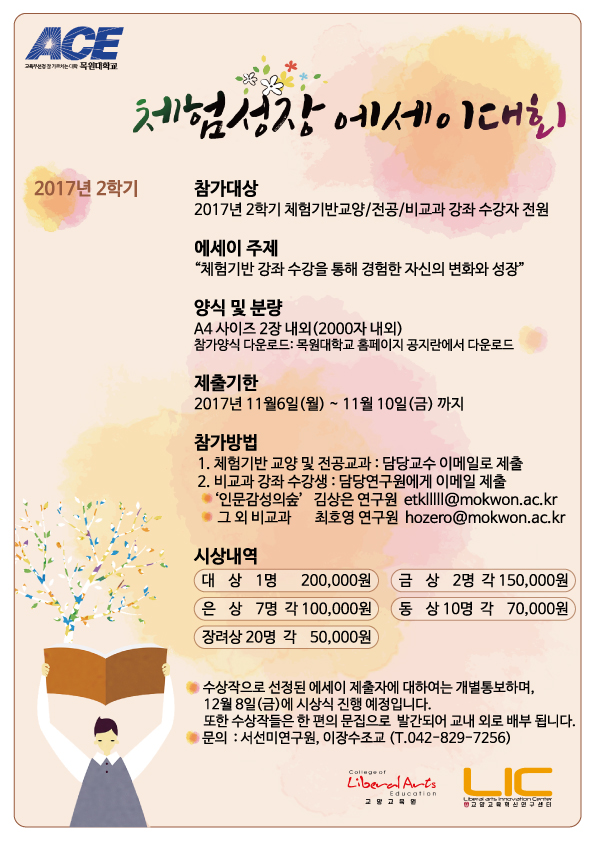 “체험기반 강좌 수강을 통해 경험한 자신의 변화와 성장” ◇양식 및 분량 A4 사이즈 2장 내외(2000자 내외) ※참가양식 다운로드: 본 공지글 첨부파일 다운로드 ◇제출기한 11월 6일(월) ~ 11월 10일(금)까지 ◇ 참가방법 1) 체험기반 교양 및 전공교과 수강생: 담당교수 이메일로 제출 2) 비교과 강좌 수강생: 담당 연구원에게 이메일 제출 ‘인문감성의 숲’ 김상은연구원 soop@mokwon.ac.kr 그 외 비교과지원 최호영연구원 acepr@mokwon.ac.kr ◇시상내역 대상 1명 200,000원, 금상 2명 각 150,000원, 은상 7명 각 100,000원, 동상 10명 각 70,000원, 장려상 20명 각 50,000원 ※ 수상작으로 선정된 에세이 제출자에 대하여는 개별통보하며, 12월 8일(금)에 시상식 진행 예정입니다. 또한 수상작들은 한 편의 문집으로 발간되어 교내․외로 배부됩니다. ※ 문의: 교양교육원 이장수조교, 서선미연구원(829-7256) |