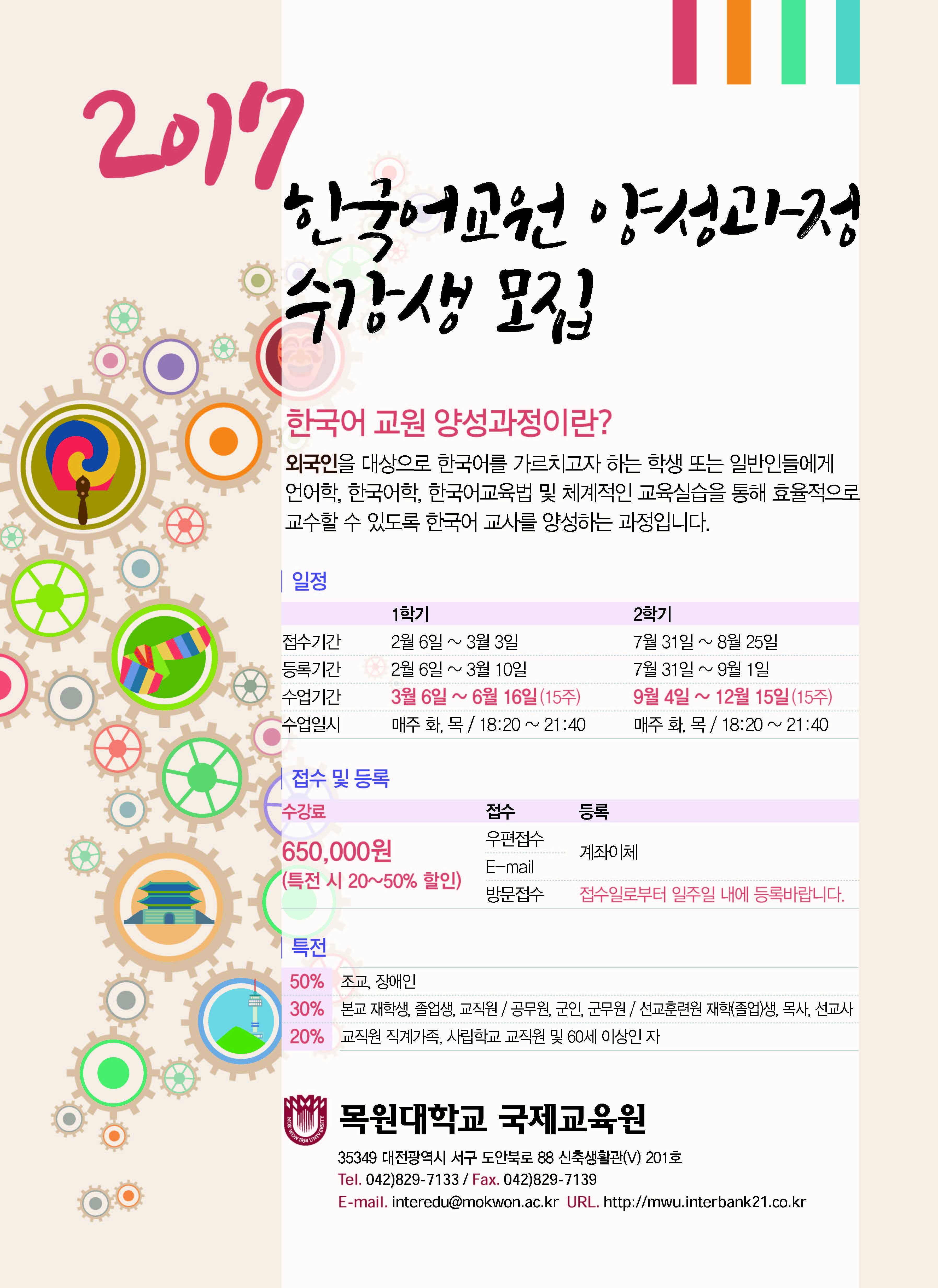 MOKWON UNIVERSITY본교 국제교육원에서는 2017학년도 2학기 한국어교원양성과정 수강생을 아래와 같이 모집합니다.