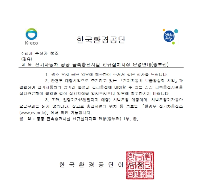 전기자동차 공공 급속충전시설 신규설치지점 운영 안내(중부권)
