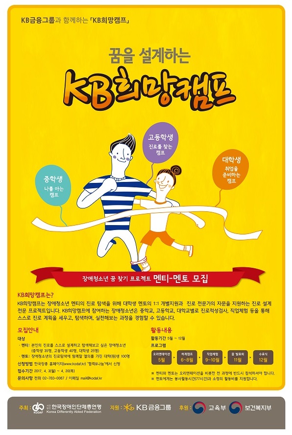 MOKWON UNIVERSITY사단법인 한국장애인단체총연맹은 장애청소년의 진로탐색 프로그램인 "KB희망캠프"를 2013년도 부터 실시하고 있습니다. 장애청소년이 구체적인 진로 행동계획(Action Plan)을 스스로 수립하고, 탐색하고, 체험하는 과정을 통해 꿈을 찾도록 지원하고자 하오니, 적극적인 관심과 많은 참여 바랍니다.