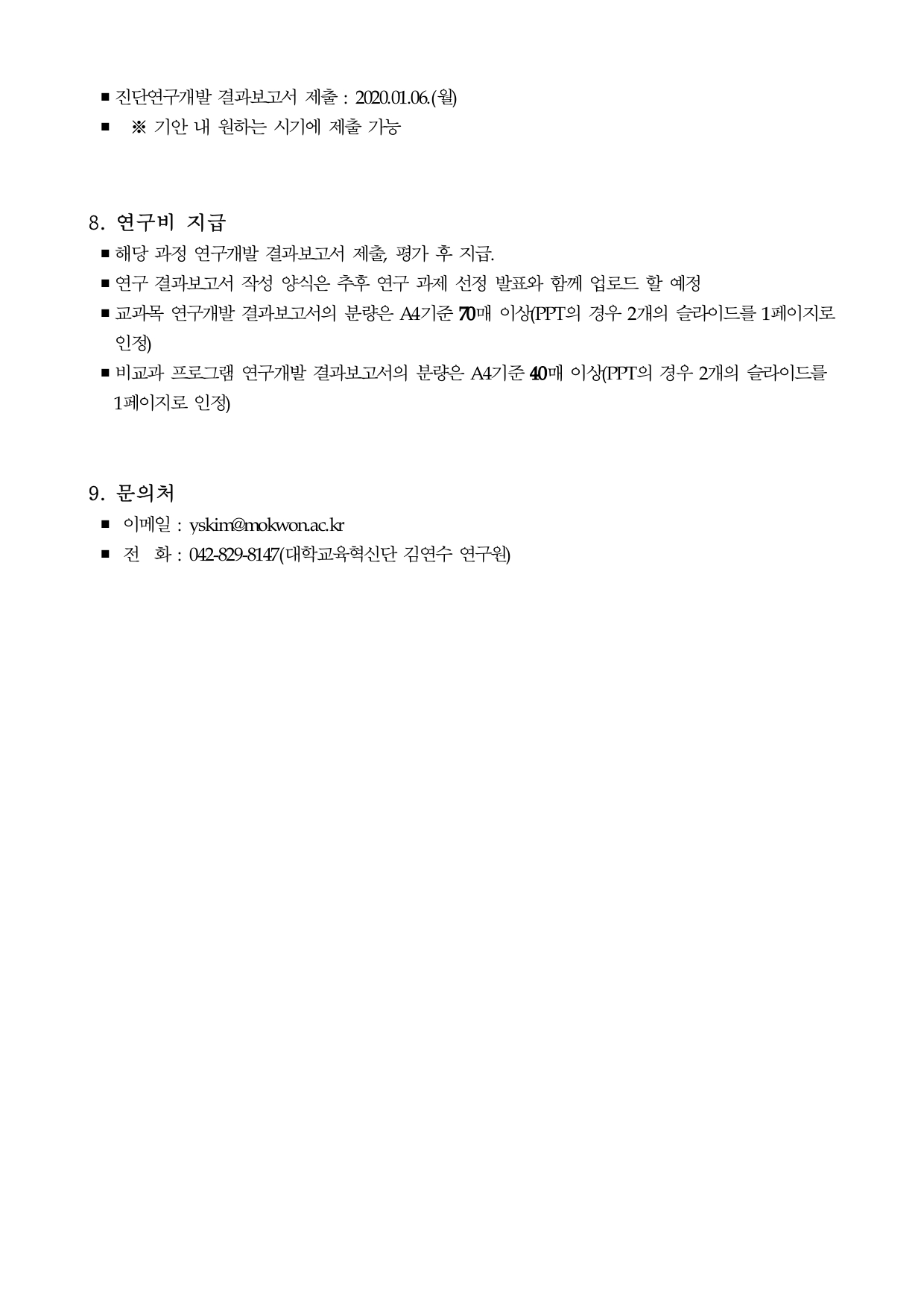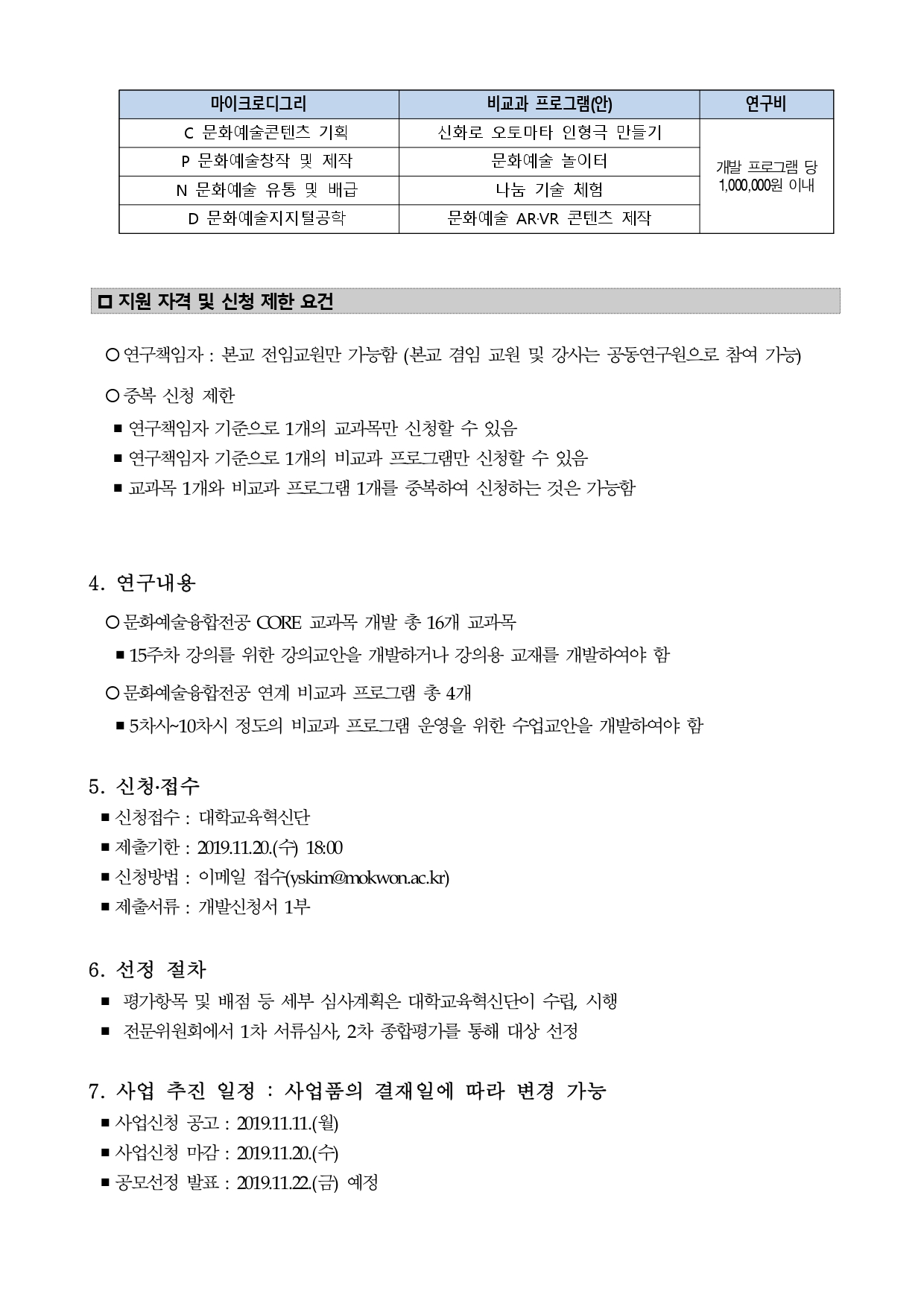 지원 자격 및 신청 제한 요건 ○연구책임자 : 본교 전임교원만 가능함 (본교 겸임 교원 및 강사는 공동연구원으로 참여 가능) ○중복 신청 제한 ▪연구책임자 기준으로 1개의 교과목만 신청할 수 있음 ▪연구책임자 기준으로 1개의 비교과 프로그램만 신청할 수 있음 ▪교과목 1개와 비교과 프로그램 1개를 중복하여 신청하는 것은 가능함 4. 연구내용 ○문화예술융합전공 CORE 교과목 개발 총 16개 교과목 ▪ 15주차 강의를 위한 강의교안을 개발하거나 강의용 교재를 개발하여야 함 ○문화예술융합전공 연계 비교과 프로그램 총 4개 ▪ 5차시~10차시 정도의 비교과 프로그램 운영을 위한 수업교안을 개발하여야 함 5. 신청․접수 ▪ 신청접수 : 대학교육혁신단 ▪ 제출기한 : 2019.11.20.(수) 18:00 ▪ 신청방법 : 이메일 접수(yskim@mokwon.ac.kr) ▪ 제출서류 : 개발신청서 1부 6. 선정 절차 ▪ 평가항목 및 배점 등 세부 심사계획은 대학교육혁신단이 수립, 시행 ▪ 전문위원회에서 1차 서류심사, 2차 종합평가를 통해 대상 선정 7. 사업 추진 일정 : 사업품의 결재일에 따라 변경 가능 ▪ 사업신청 공고 : 2019.11.11.(월) ▪ 사업신청 마감 : 2019.11.20.(수) ▪ 공모선정 발표 : 2019.11.22.(금) 예정 ▪ 진단연구개발 결과보고서 제출 : 2020.01.06.(월) ※ 기안 내 원하는 시기에 제출 가능 8. 연구비 지급 ▪ 해당 과정 연구개발 결과보고서 제출, 평가 후 지급. ▪ 연구 결과보고서 작성 양식은 추후 연구 과제 선정 발표와 함께 업로드 할 예정 ▪ 교과목 연구개발 결과보고서의 분량은 A4기준 70매 이상(PPT의 경우 2개의 슬라이드를 1페이지로 인정) ▪ 비교과 프로그램 연구개발 결과보고서의 분량은 A4기준 40매 이상(PPT의 경우 2개의 슬라이드를 1페이지로 인정) 9. 문의처 ▪ 이메일 : yskim@mokwon.ac.kr ▪ 전 화 : 042-829-8147(대학교육혁신단 김연수 연구원)