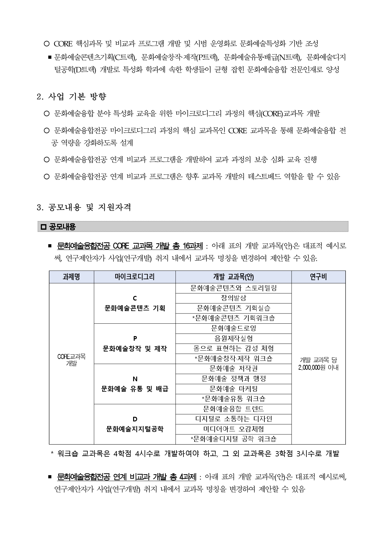 사업 목적 ○ CORE 핵심과목 및 비교과 프로그램 개발 및 시범 운영화로 문화예술특성화 기반 조성▪문화예술콘텐츠기획(C트랙), 문화예술창작·제작(P트랙), 문화예술유통‧배급(N트랙), 문화예술디지털공학(D트랙) 개발로 특성화 학과에 속한 학생들이 균형 잡힌 문화예술융합 전문인재로 양성 2. 사업 기본 방향 ○ 문화예술융합 분야 특성화 교육을 위한 마이크로디그리 과정의 핵심(CORE)교과목 개발 ○ 문화예술융합전공 마이크로디그리 과정의 핵심 교과목인 CORE 교과목을 통해 문화예술융합 전공 역량을 강화하도록 설계 ○ 문화예술융합전공 연계 비교과 프로그램을 개발하여 교과 과정의 보충 심화 교육 진행 ○ 문화예술융합전공 연계 비교과 프로그램은 향후 교과목 개발의 테스트베드 역할을 할 수 있음 3. 공모내용 및 지원자격 공모내용 ▪문화예술융합전공 CORE 교과목 개발 총 16과제 : 아래 표의 개발 교과목(안)은 대표적 예시로써, 연구제안자가 사업(연구개발) 취지 내에서 교과목 명칭을 변경하여 제안할 수 있음.