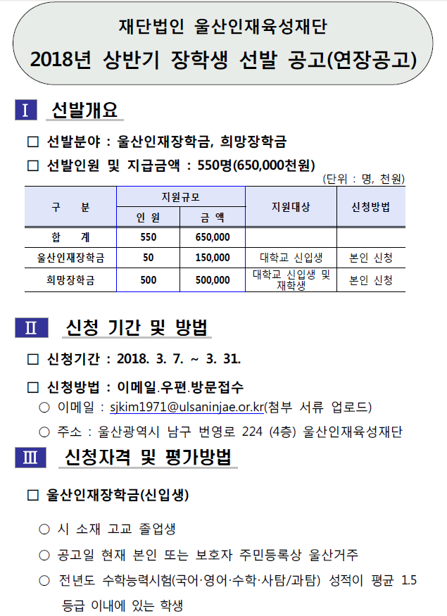 2018년 상반기 (재)울산인재육성재단 장학생 선발 연장 안내
