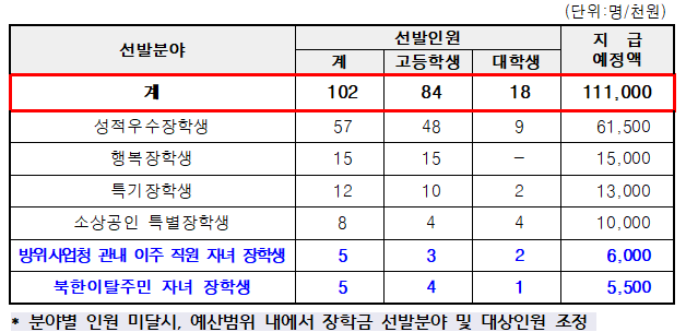 마. 방위사업청 관내 이주 직원 자녀 특별장학생(고등학생 3, 대학생 2)