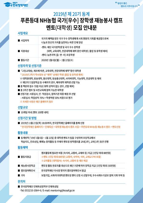 □ 관련 문의: 한국장학재단 대학생 재능봉사 사무국(T.053-210-1064).