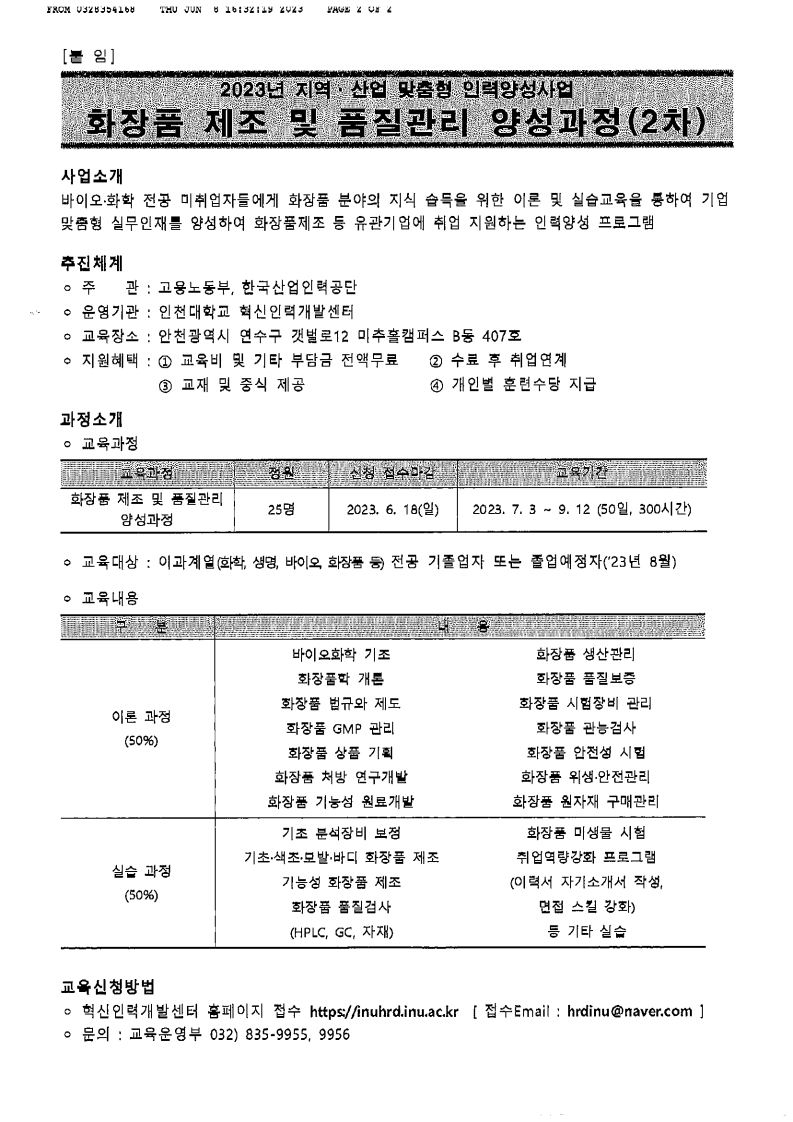 1. 인천대학교는 고용노동부에서 지원하는 「지역·산업 맞춤형 인력양성사업」 운영기관으로 지정받아 바이오·화학 산업분야의 미취업 구직자에게 실무중심의 「화장품 제조 및 품질관리 양성과정」 교육과정을 실시하고 수료 후 협약기업에 채용연계하고 있습니다.