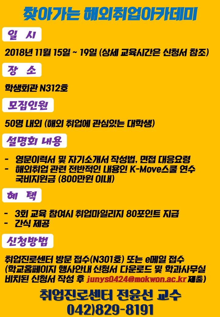 취업진로센터에서는 글로벌 취업역량 함양 및 해외취업 활성화를 위하여 유관기관과 협조를 통해 ‘찾아가는 해외취업아카데미’를 진행하고자 합니다. 학생들의 많은 참여 바랍니다.