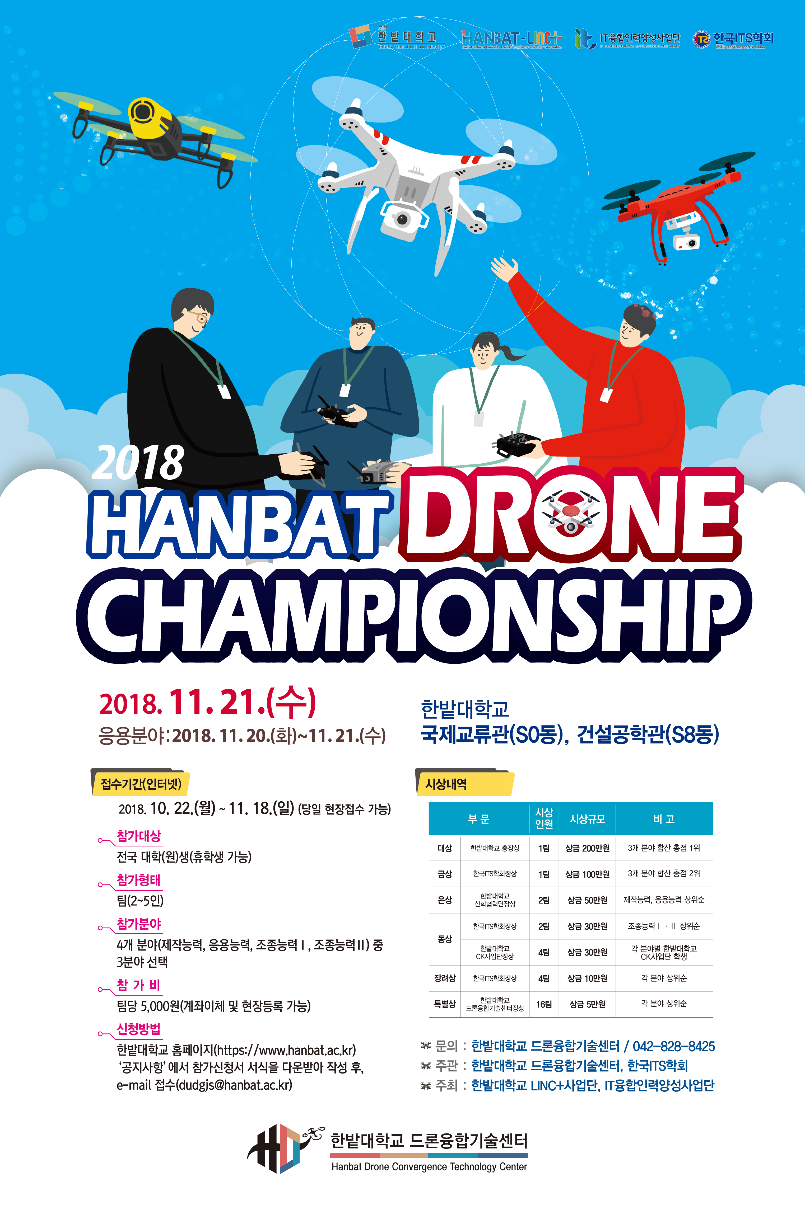 MOKWON UNIVERSITY한밭대학교 드론융합기술센터와 한국ITS학회가 공동으로 개최하는 본 대회를 통해 4차 산업혁명을 주도할 드론을 직접 체험함으로써 창의력과 과학적 사고력을 배양하여 학습동기부여 및 취업 경쟁력을 향상시키려하니 학생들의 많은 참여 바랍니다. 대회명: 2018 Hanbat Drone Championship 기간: 2018. 11. 20.(화) ~ 11. 21.(수) 대상: 전국 대학(원)생 신청방법: 붙임문서 참조 붙임 1. 2018 Hanbat Drone Championship 공고문 1부. 2. 2018 Hanbat Drone Championship 대회규칙 1부. 3. 2018 Hanbat Drone Championship 신청서 1부. -취업지원과- |