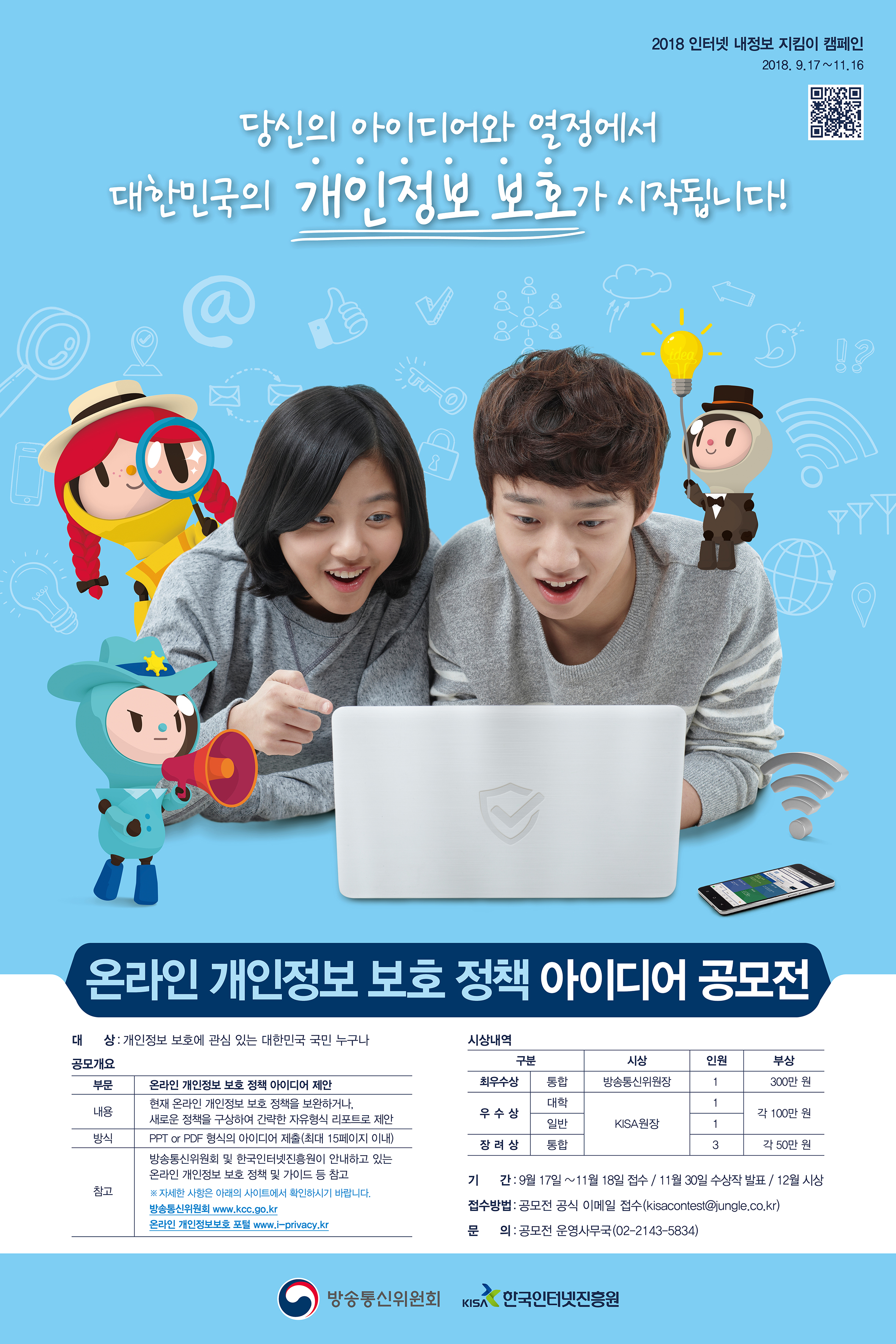 MOKWON UNIVERSITY2018 온라인 개인정보 보호 정책 아이디어 공모전 공모요강 공모요강 ◆참가자격 : 개인정보 보호에 관심 있는 대한민국 국민 누구나 (팀 제출 가능하며, 최대 3인까지) ◆공모주제 : 온라인 개인정보 보호 정책 아이디어 제안 - 현재 온라인 개인정보 보호 정책을 보완하거나 새로운 정책을 구상하여 간략한 자유형식 리포트로 제안 ◆제출형식 : PPT 혹은 PDF 파일의 자유형식 리포트로 제출 (최대 15페이지 이내, 용량 10MB이하) ◆참고 : 방송통신위원회 및 한국인터넷진흥원이 안내하고 있는 온라인 개인정보 보호 정책 및 가이드 등 참고 ※ 자세한 사항은 아래의 사이트에서 확인하시기 바랍니다. 방송통신위원회 www.kcc.go.kr 온라인 개인정보보호 포털 www.i-privacy.kr ◆접수방법 : 공모전 공식 이메일 계정을 통한 온라인 접수 반드시 이름, 핸드폰번호를 메일 본문에 작성하여 접수 팀으로 제출 시 팀원 전원의 이름, 핸드폰번호 작성하여 접수 ◆접수기간 : 2018. 9. 17.~11. 18. ◆심사일정 : 2018. 11. 23.~28. ◆결과발표 : 2018. 11. 30. ◆시상식 : 2018. 12. (시상식 일정은 추후 안내 예정) ◆시상내역 : 총 650만원