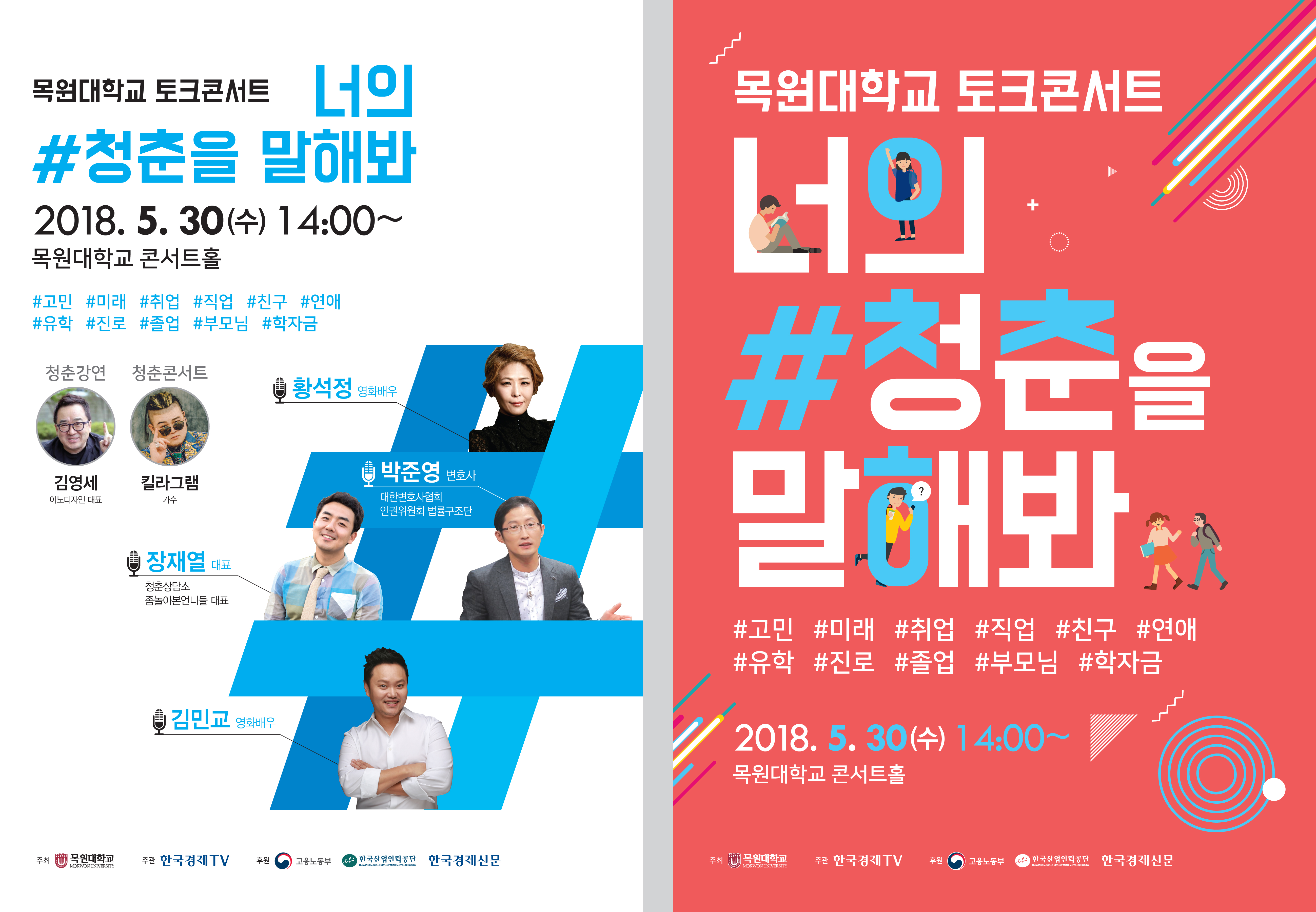 MOKWON UNIVERSITY목원대학교에서 재학생 및 졸업생들에게 청년실업 및 미래 불확실성에 대한 희망설계 및 동기부여 기회를 제공하고자 한국경제tv와 공동으로 “2018 목원대학교 토크콘서트 _ 너의 #청춘을 말해봐”를 기획 구성하여 아래와 같이 개최하게 되었음을 알려드립니다.