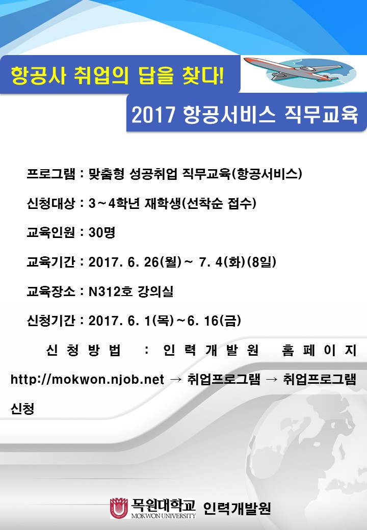 1. 2017년 맞춤형 성공취업 직무교육[항공서비스8기] 프로그램 개요 가. 교육목적 : 항공서비스 분야 기업체가 요구하는 직무교육을 통해 취업으로 연계될 수 있는 기회 제공 나. 교육기간 : 2017년 06월 26일(월) ~ 2017년 07월 04일(화) 다. 교육대상 : 3~4학년 재학생(선착순 접수) 라. 교육인원 : 30명 마. 교육장소 : 학생회관 N312호 강의실 2. 신청서 접수 : 2017. 06. 16(금) 까지 인력개발원 홈페이지 접수 3. 교육일정 - 1일차 : 06.26(월) [ 09 :00 ~19 : 30 ] - 2일차 : 06.27(화) [ 09 :00 ~19 : 30 ] - 3일차 : 06.28(수) [ 09 :00 ~19 : 30 ] - 4일차 : 06.29(목) [ 09 :00 ~19 : 30 ] - 5일차 : 06.30(금) [ 09 :00 ~19 : 30 ] - 6일차 : 07.01(토) [ 10 : 00 ~18 : 00 ] - 7일차 : 07.03(월) [ 10 : 00 ~18 : 00 ] - 8일차 : 07.04(화) [ 10 : 00 ~18 : 00 ] 4. 참가자 특혜 가. 항공서비스 분야 취업연계 과정을 통한 취업알선 지원 나. 수료증 발급 다. 취업역량 마일리지 적립 5. 문의처 : 인력개발원 ☎)042-829-8190