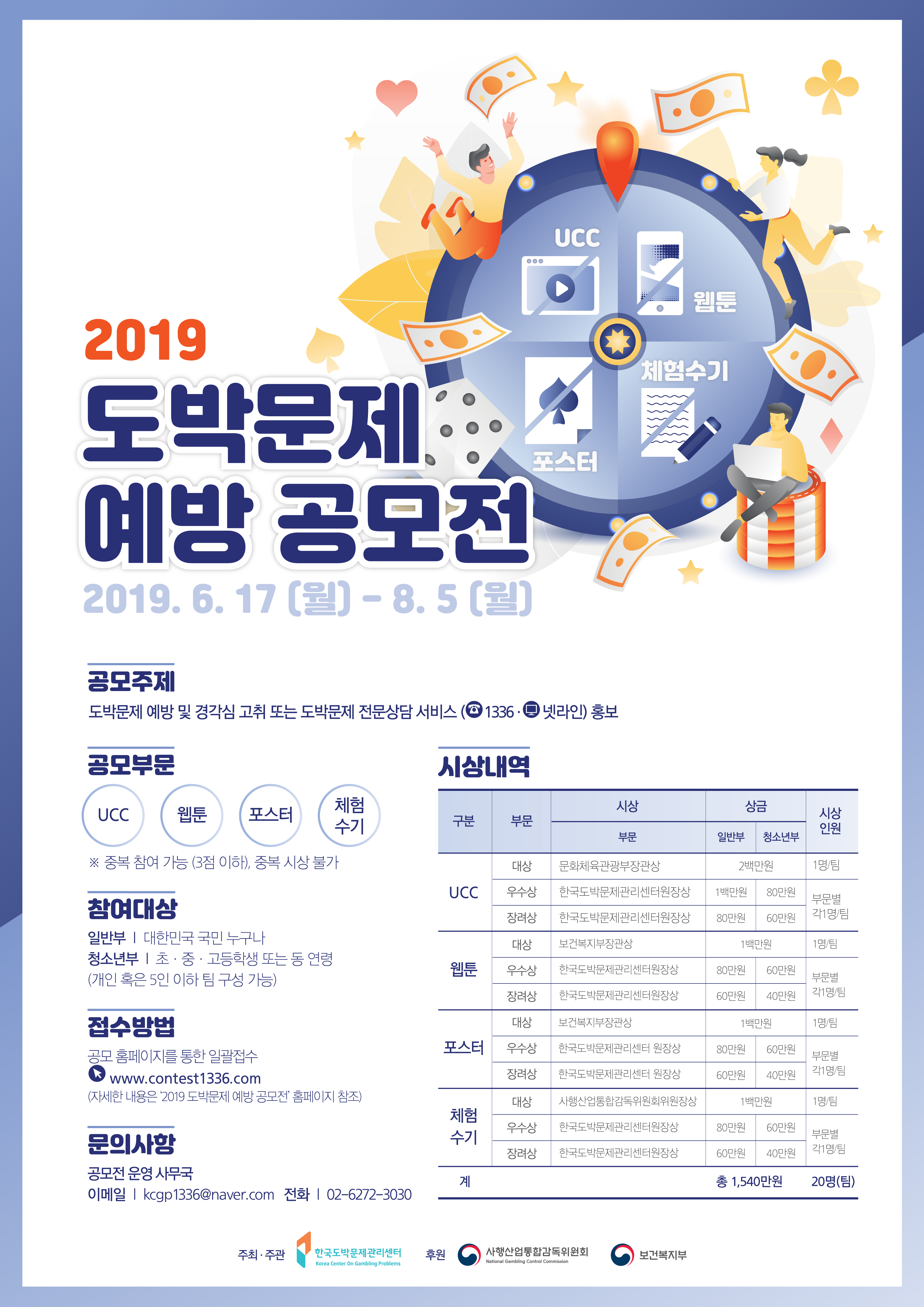 한국도박문제관리센터는 도박문제에 대한 심각성을 알리고 도박문제 예방효과를 제고하기 위해「2019년 도박문제 예방 공모전」을 개최합니다. 이에 본 공모전이 성공적으로 개최 될 수 있도록 많은 참여를 바랍니다.