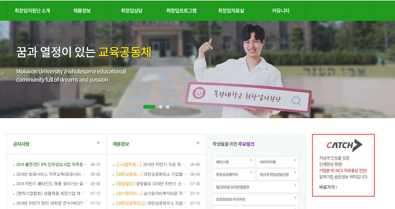MOKWON UNIVERSITY검사방법: http://univ.catch.co.kr/ >> 회원가입(무료) >> 학교회원 진단하기 >> 목원대학교 선택 후 "다음" 클릭 >> 무료진단(진단하고자하는 항목 선택 후 아래의 대학인증번호(17@mwu92!) 입력 >> 검사시작~ 문의 : 취업지원과 7155, 7152 - 취업지원과 - 검사절차안내 1. http://univ.catch.co.kr/ >> 회원가입 2. CATCH 홈페이지 왼쪽 중간에 학교회원 진단하기 클릭 3. 목원대학교를 선택한 후 다음을 클릭 4. 무료진단에서 내림버튼을 클릭하여 진단선택을 한다. 5. 대학인증번호(17@mwu92!) 입력후 다음 클릭하여 검사를 시작한다. |