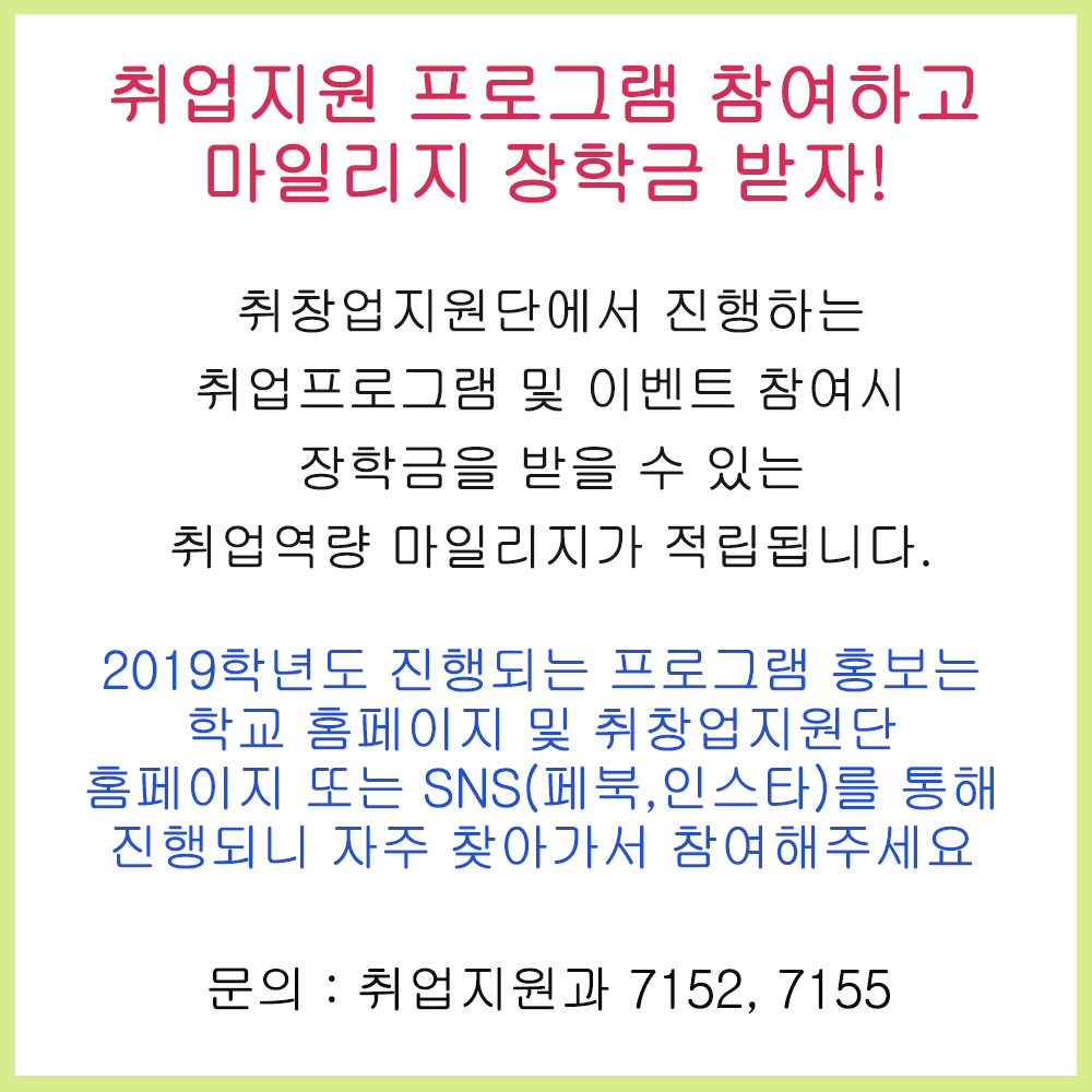 1. 홍보내용 : 취업역량 마일리지 장학금 2. 지급시기 : 2020년 1월~2월 중 지급 될 예정임. 3. 지급기준 : 취창업지원단에서 진행하는 취업지원관련 프로그램 및 각종 이벤트 참여자. (붙임파일 참조. 단, 붙임파일에 기재되지 않은 프로그램의 경우, 기존 프로그램과 비교하여 동일하게 마일리지 적용.) 4. 기타 가 : 취업역량마일리지는 장학규정에 따라 지급 되며, 종합정보시스템에 입력된 계좌로 입금되니 꼭 계좌등록을 해주셔야됩니다. 나 : 장학규정에 따라 휴학 및 제적학생, 이수학기 초과자, 최소학점 미 이수자 등은 장학생으로 선발 될 수 없으니 참고 하시기 바랍니다. 5. 취창업지원단 홈페이지 : 목원대학교 취창업지원단 홈페이지 : https://career.mokwon.ac.kr/ 페이스북 페이지 : https://www.facebook.com/mwjob.net 네이버 카페(취창업지원단) : http://job.mokwon.ac.kr 인스타그램(취창업지원단) : 계정 - mw_job_coaching 6. 문의: 취업지원과 7152, 7155