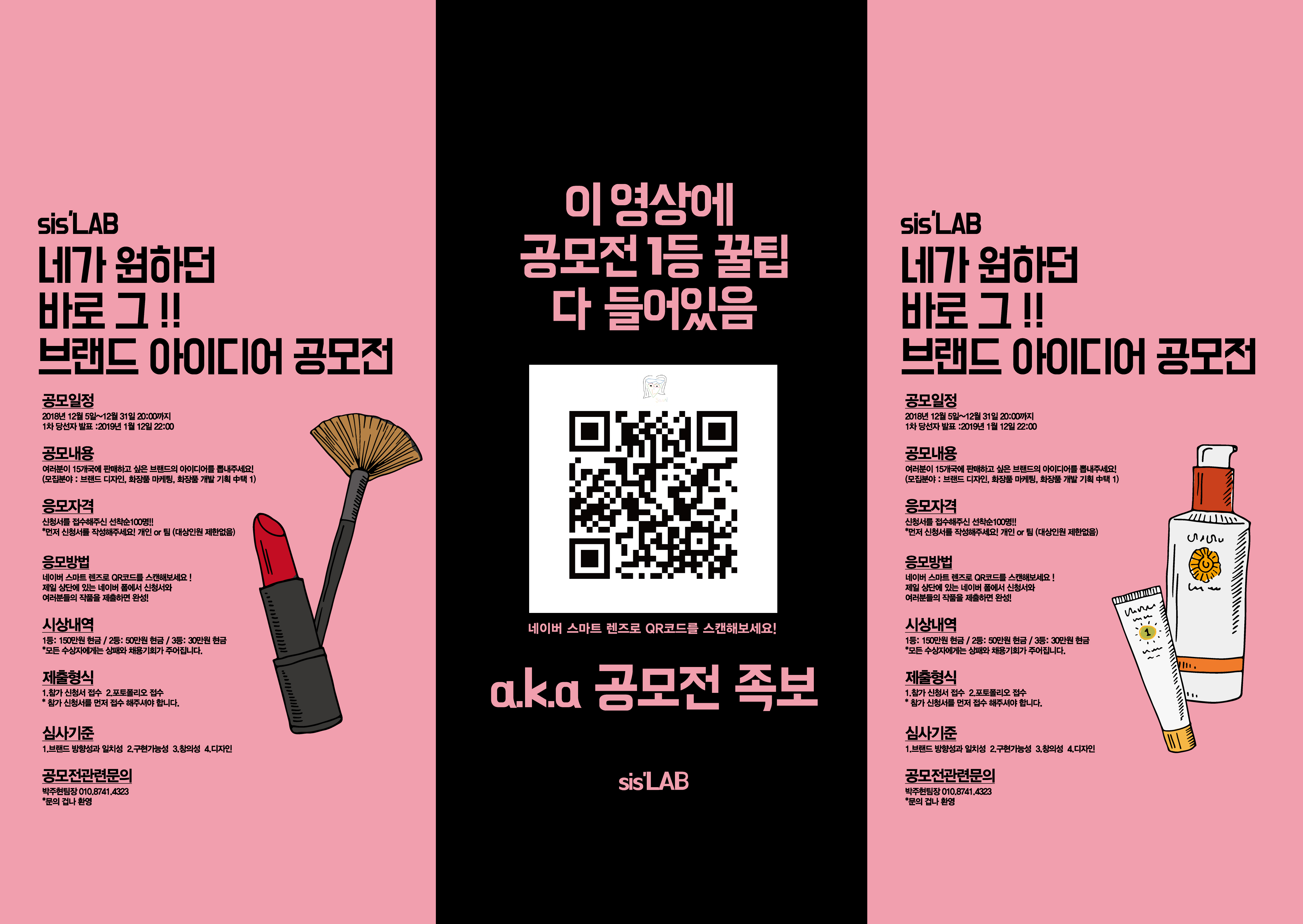 MOKWON UNIVERSITY▷주제 여러분이15개국에 판매하고 싶은 브랜드의 아이디어를 뽑내주세요! (모집분야: 브랜드 디자인, 화장품 마케팅, 화장품 개발 기획 中택 1) ▷ 기간 및 응모 일정 2018년12월5일~2018년12월31일 1. 포토폴리오 접수마감 (2018년12월5일~201년12월31일 20:00) 2. 심사기간 (2019년1월2일~2019년1월7일) 3. 최종3인 발표 (2019년1월7일 22:00) 4. 최종3인PT (2019년1월12일 - 시간차후결정) 5. 결과발표 (2019년1월14일) ▷ 공모전 사이트 (자세히보기) : <a href="http://m.site.naver.com/ ▷ 응모자격 신청서를 접수해주신 선착순 100명! * 먼저 신청서를 작성해주세요! 개인or팀 (대상, 인원 제한없음) ▷ 심사기준 및 방법 1. 브랜드 방향성과 디자인의 일치성 2. 디자인 구현 가능성 3. 창의성 4. 디자인성 ▷ 제출/접수 방법 1. 포스터에 있는 QR코드를 스캔한다. 2. 링크되어있는 선착순100명참가신청링크를 클릭한다. 3. 참가 신청서를 먼저 제출한다. (이름, 성별, 나이, 전공, 전화번호 끝) 4. 31일전까지 포토폴리오및 작품을 제출한다. ▷작품규격 : 마케팅 지원자 - 규격없음 상품개발/기획 지원자 - 규격없음 디자인 지원자 - A3사이즈, PDF 형 파일명 - (sis"LAB BI 공모전지원분야&팀명or이름) ▷시상내역 : 1등: 현금150만원 / 2등: 현금50만원 / 3등: 현금30만원 * 모든 수상자에게는 상패와 채용기회가 주어집니다. |