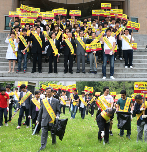 5월 23(월) 오전 10시 중앙도서관 앞 광장에서는 우리 대학 김원배 총장과 본부 보직자, 총학생회 및 단과대학학생회 임원, 소방안전관리학과 학생 등 60여명이 참석한 가운데 금연 캠페인 홍보를 위한 교내 가두행진과 더불어 담배꽁초 줍기 운동을 벌였다.