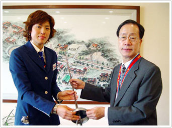 김희정 선수는 “이번에 금메달을 획득하고 분신과 같은 펜싱 검을 모교에 전달하게 된 것은 영광”이라면서 “그 동안 아낌없이 지원해 주고 성원해 준 모교와 대전시민에 대한 조그만 보답일 뿐”이라며 겸손해 하였습니다.