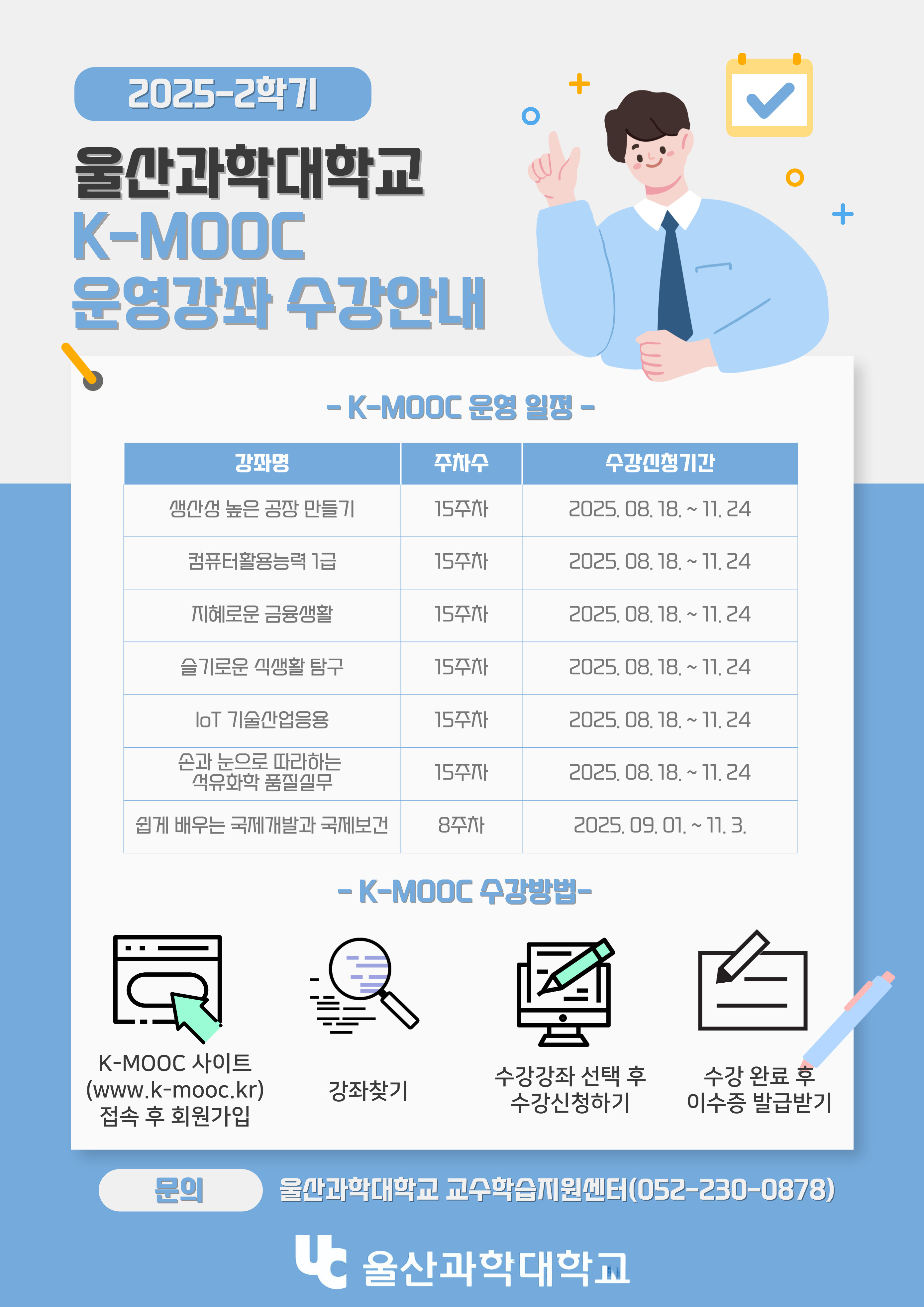 MOKWON UNIVERSITY울산과학대학교에서는2025학년도 2학기 한국형 온라인 공개강좌(K-MOOC)를 아래와 같 이 운영하오니,귀 기관의 교직원 및 학생들이 수강할 수 있도록 홍보하여 주시기 바랍니다.