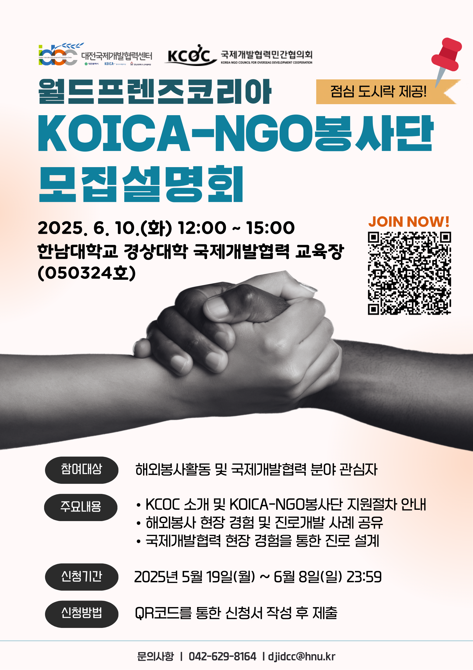 2025년 6월 10일(화) 12시부터 15시까지 '2025년 WFK KOICA-NGO봉사단 모집설명회'를 개최합니다! 포스터와 아래 정보를 확인하시어, 관심 있는 분들의 많은 참여 바랍니다!