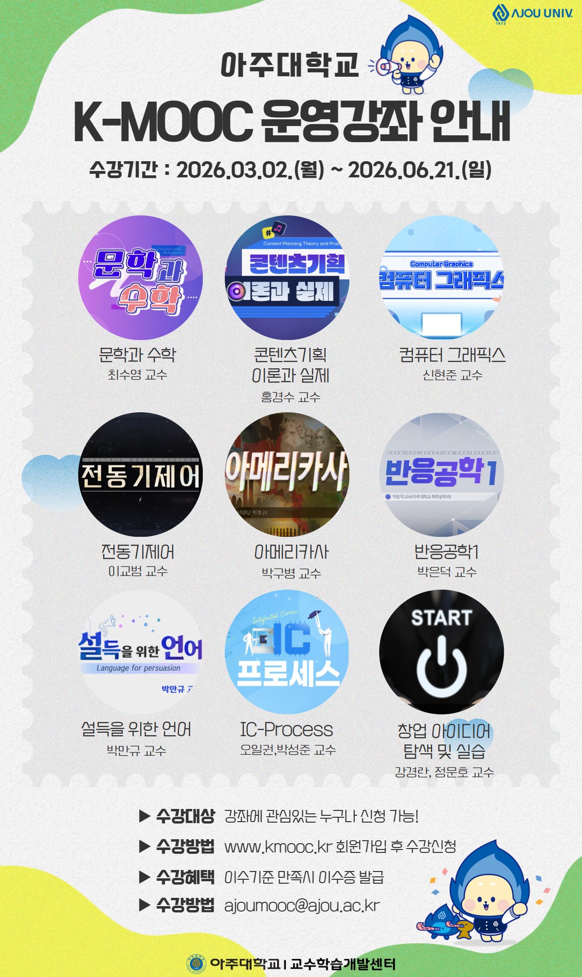 - 아주대학교 교수학습개발센터(031-219-3609, ajoumooc@ajou.ac.kr)
