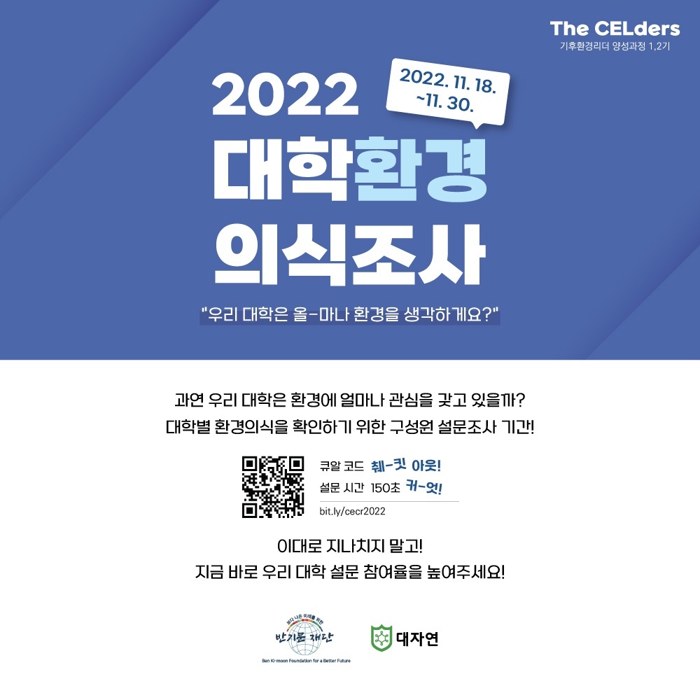 안녕하세요! 쌀쌀한 날씨가 계속 되지만 기분 좋은 금요일입니다! 목원대 학생 여러분들께서는 즐거운 하루, 보내고 계신가요? 저(희)는 반기문재단x대자연에서 운영하는 기후환경리더 양성과정 1,2기 대학생 The CELders입니다!