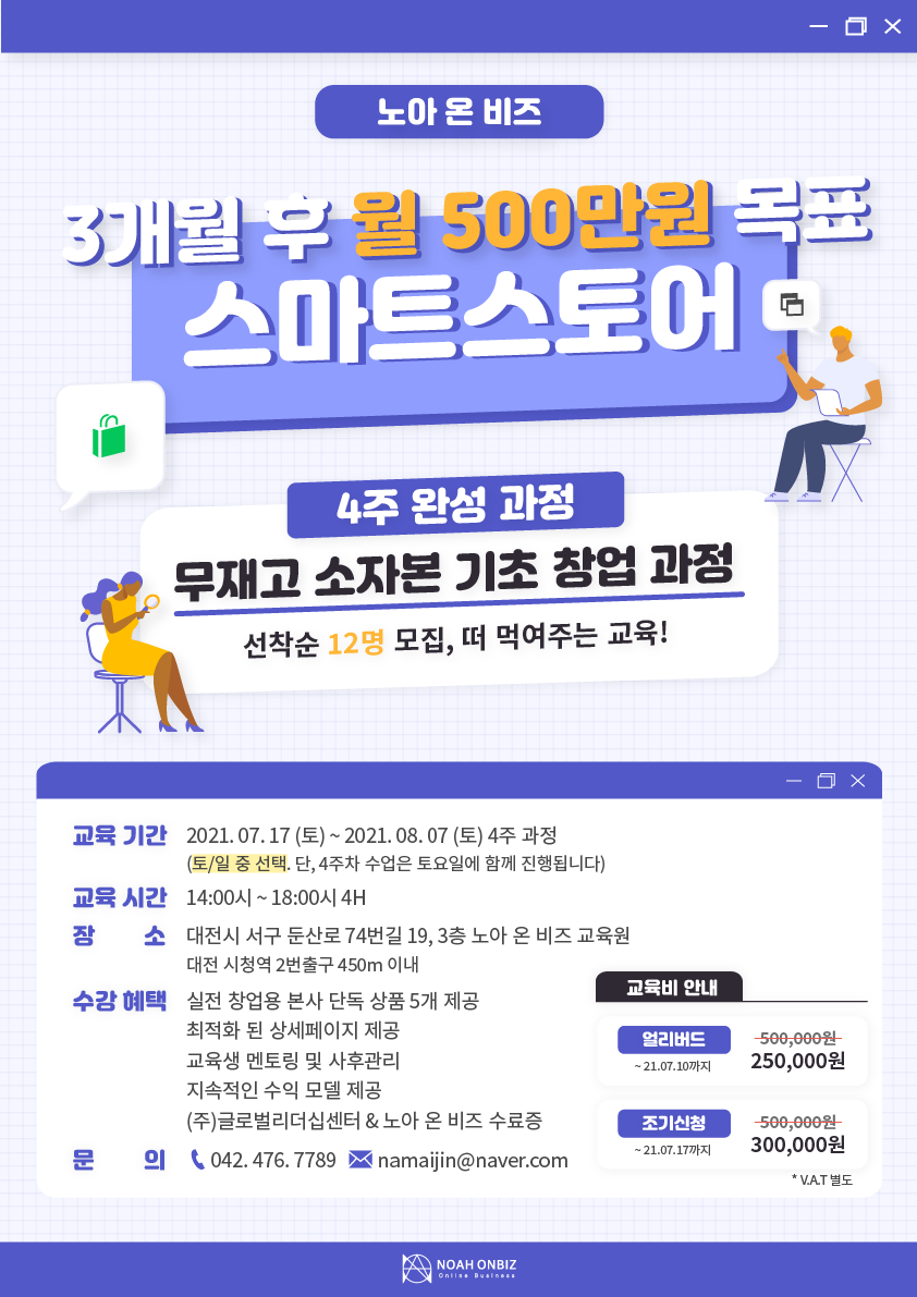 방학 동안 뭘 해야 할지 고민이었다면 4주 과정으로 부담 없이 배워가세요! 판매할 물건이 없어도 걱정 마세요! 노아 온비즈에 입점 되어있는 상품들을 골라서판매할 수 있습니다.