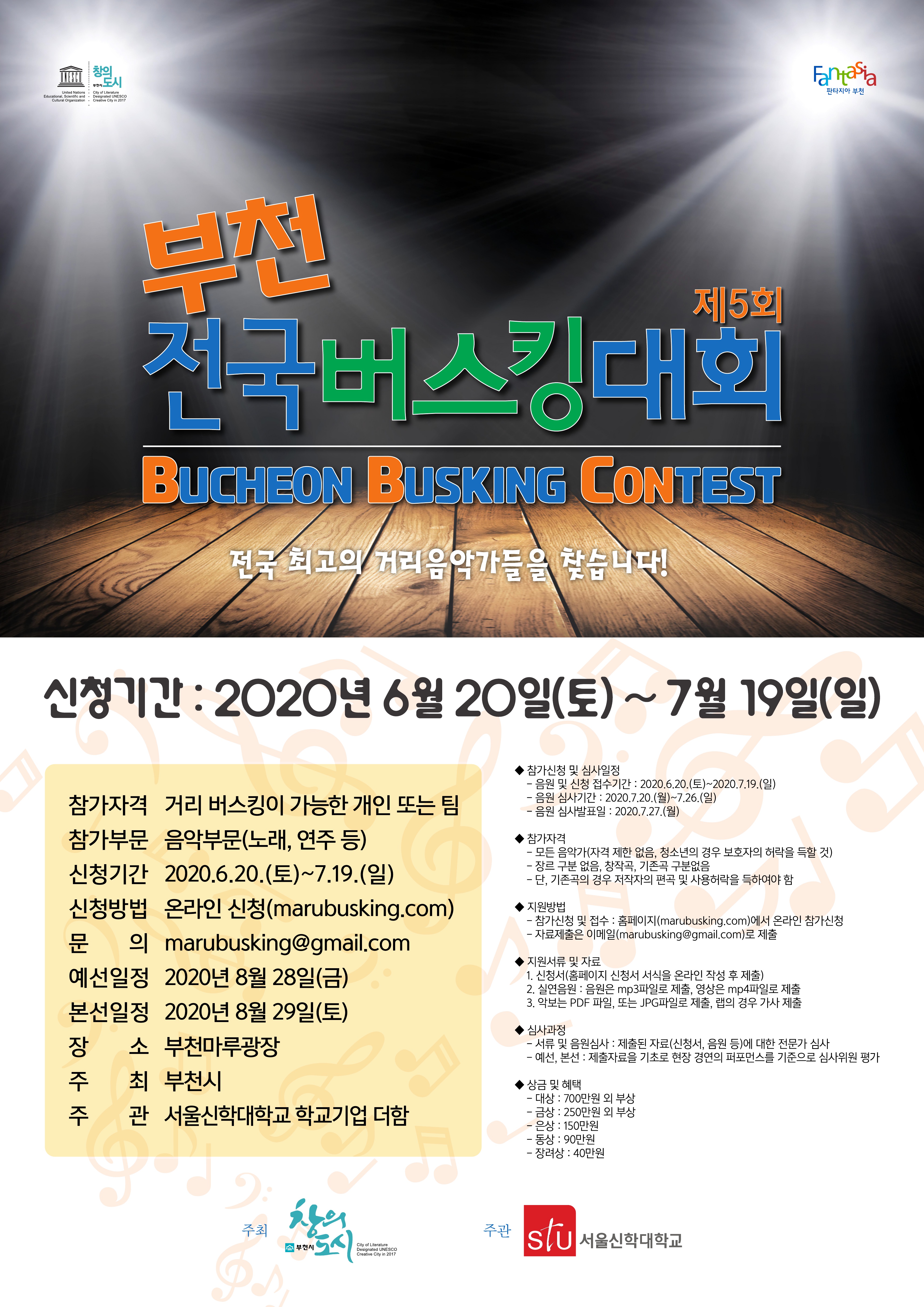 | 제5회 부천전국버스킹대회 개요 | | | | ? 행사일시 : 2020. 8. 28.(금) 18:00 예선 / 2020. 8. 29.(토) 19:00 본선 ? 장 소 : 부천마루광장 (부천 북부역 광장) / 우천 시, 부천시민회관 ? 주최/주관 : 부천시 / 서울신학대학교 학교기업 더함 (대표 : 함춘호) ? 상 금 : 대상 700만원, 금상 250만원, 은상 150만원 , 동상 90만원, 장려 40만원 ? 관 람 비 : 무료 ? 주요내용 : 사전심사, 예선(45팀) 및 본선(12팀) 경연, 축하공연, 시상 등 |