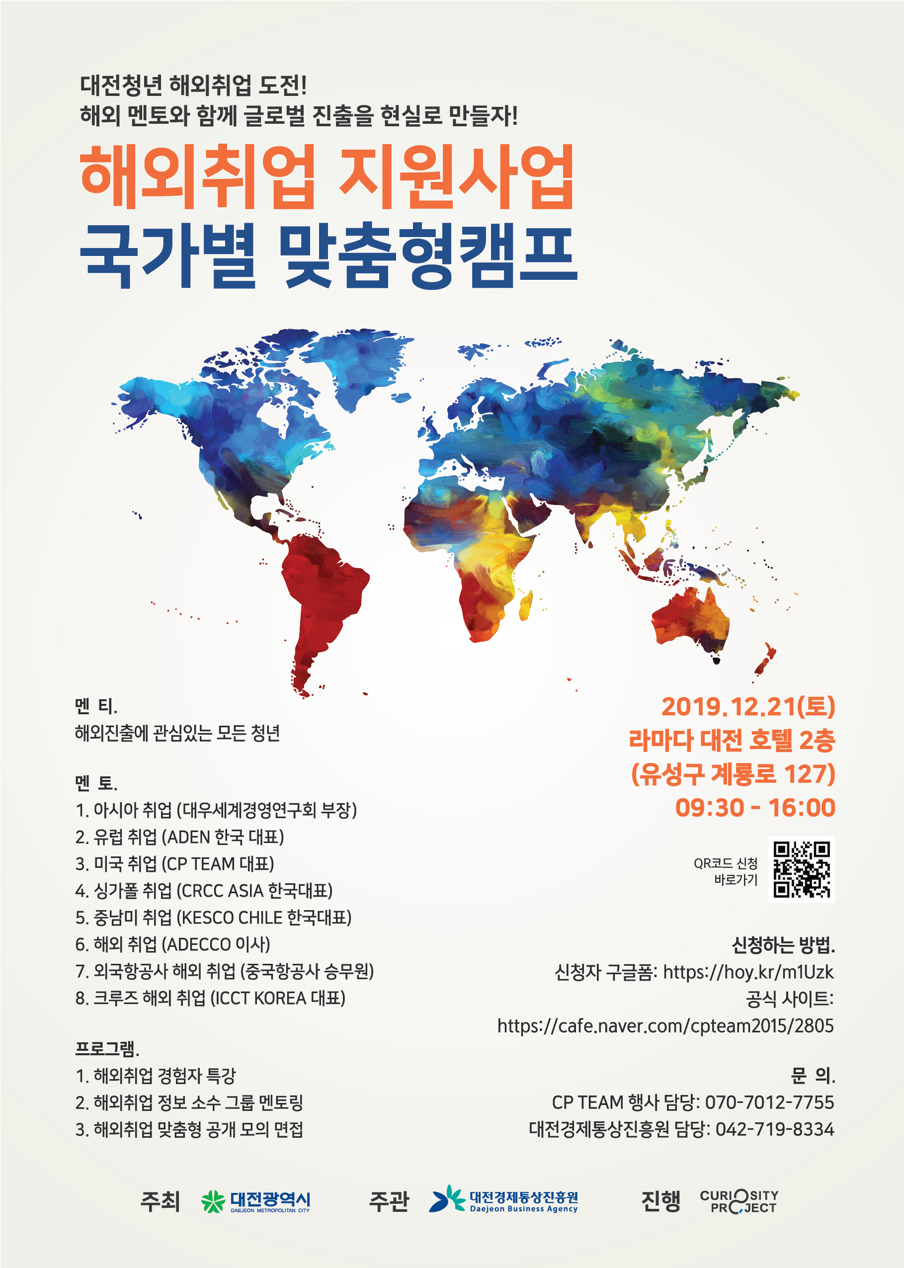 가. 일시 : 2019.12.21.(토) 09:30~, 라마다대전호텔 2층(유성구 계룡로 127) - 해외취업 경험자 특강, 국가별 전문가와 함께 그룹 멘토링 등